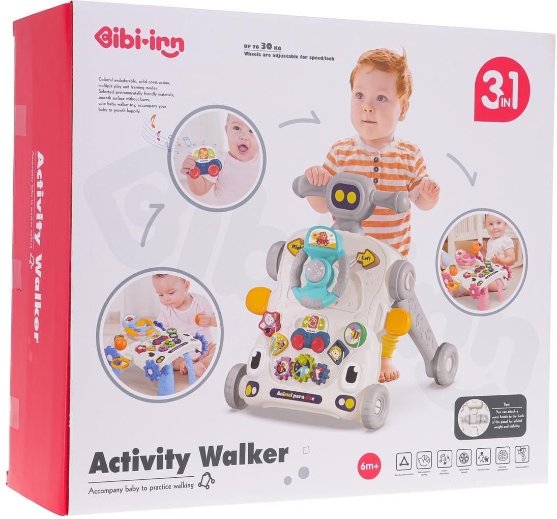 Opis Wielofunkcyjny Chodzik Niebieski Chodzik edukacyjny, interaktywny stolik 2 w 1 dla dzieci od 12 miesięcy życia. Kolorowa, multifunkcyjna zabawka stymuluje rozwój dziecka na różnych płaszczyznach. Pchaczyk da się szybko przekształcić w stolik multifunkcyjny. Zdejmowany, kolorowy panel posiada dużo ruchomych elementów, które się da obracać, przesuwać, wciskać. Dodatkowo z panelu dziecko może również wyjąć mały interaktywny samochodzik i zabrać go wszędzie ze sobą. Samochodzik posiada efekty dźwiękowe i świetlne, a zasilany jest bateriami typu 2 x AAA 1,5 V (brak w zestawie). Funkcje zestawu - odpowiedni dla dzieci od 12-go miesiąca życia, wykonany z najlepszej jakości materiałów, efekty dźwiękowe w samochodziku: melodie, odgłosy otwierania pojazdu, odpalania pojazdu, odgłosy jazdy, śmiech dziecka, dzwonki), efekty dźwiękowe pozostałe: terkotanie kierownicy i kół zębatych, piszczałka w kierownicy, efekty światła: mrugający przycisk z misiem w wyjmowanym z panelu samochodziku, możliwość przekształcenia pchaczyka w stolik, bezpieczne kółeczka z gumowymi nakładkami, regulowana wysokość rączki 2-stopniowa, kosz do mini koszykówki z piłeczką, obrotowa kierownica z piszczałką, sorter kształtów, obrotowe kółka zębate. Elementy panelu interaktywnego koszykówka, kosz z piłeczkami, obrotowa kierownica z piszczałką, wyjmowany samochodzik z efektami dźwięku i światła, ruchome zębatki, klocuszki z doczepianymi sznureczkami służące do nauki dopasowywania kształtów. Wymiary chodzik, wysokość regulowana od 44 cm do 47 cm, szerokość ok. 39 cm, głębokość ok. 39 cm, stolik multifunkcyjny ok. 36 cm x 42 cm x 24 cm, samochodzik ok. 9,5 cm x 7,5 cm x 3,5 cm, piłeczka do kosza o średnicy ok. 5,5 cm, średnica kosza do koszykówki ok. 8 cm, średnica kółek tylnych ok. 9,5, przednik ok. 9 cm, opakowanie ok. 39 cm x 35 cm x 14,3 cm. Zawartość zestawu elementy konstrukcyjne chodzika i stolika, piłeczka, śrubokręt, naklejki dekoracyjne, instrukcja obsługi.