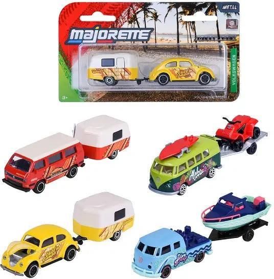 Majorette Volkswagen z przyczepką, 4 rodz. - wysyłka losowo.Metalowe samochody na licencji Volkswagen. Pojazdy posiadają otwierane elementy, takie jak np. drzwi, maskę czy też bagażnik. Każdy pojazd posiada przyczepkę.