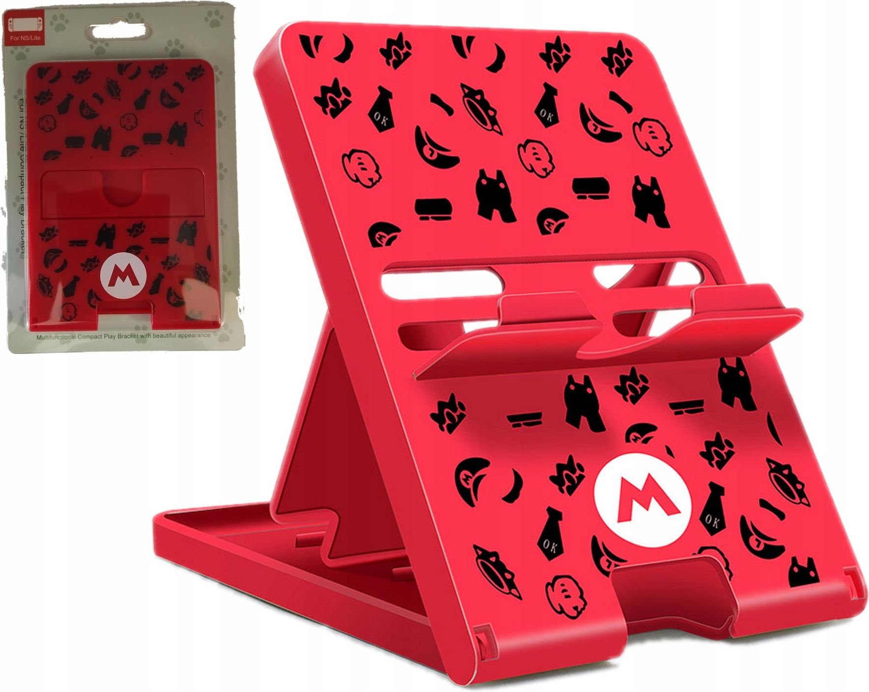SKŁADANA PRZENOŚNA PODSTAWKA STAND STOJAK POD KONSOLE NINTENDO SWITCH 2 Składana podstawka do konsol Nintendo Switch to praktyczny i stylowy gadżet, który sprawdzi się zarówno w domu, jak i w podróży. Wykonana z lekkiego i wytrzymałego plastiku, posiada 4-stopniowąregulację kąta nachylenia, dzięki czemu możesz wygodnie ustawić ekran konsoli podczas grania, oglądania filmów lub korzystania z aplikacji. Stabilna konstrukcja z dolnymi ramionami zapewnia pewne podparcie i chroni przed zsuwaniem się urządzenia, a specjalne wycięcie pozwala na jednoczesne korzystanie z ładowarki w trakcie rozgrywki. Po złożeniu podstawka zajmuje bardzo mało miejsca, co czyni ją wyjątkowo poręczną i łatwą do przenoszenia – zmieści się w plecaku, torbie czy nawet w większej kieszeni razem z akcesoriami. Unikalny design inspirowany światem Animal Crossing – biały korpus ozdobiony kolorowymi motywami i charakterystycznym zielonym liściem nadaje jej wyjątkowego uroku i sprawia, że doskonale pasuje do klimatu gier Nintendo. To idealne rozwiązanie dla graczy, którzy chcą połączyć wygodę i funkcjonalność z oryginalnym wyglądem i cieszyć się pełnym komfortem rozgrywki na swojej konsoli Nintendo Switch w każdej sytuacji. Opis Ilość: 1x Składana podstawka Kolor: Czerwona; Wzór: Mario; Rozmiar: Złożona - 13,5x9,5x1cm; Gumowe nóżki zapewniające stabilizacje; 4 -stopniowa Regulacja kąta nachylenia (40-70 stopni) – dostosujesz ustawienie ekranu do własnych potrzeb. Stabilna konstrukcja – antypoślizgowe ramiona pewnie trzymają urządzenie. Wycięcie na kabel – możliwość ładowania podczas korzystania. Unikalny design; Lekka i Poręczna; Opakowanie: Karton producenta; Kompatybilność: Konsola Nintendo switch, switch lite oraz OLED Nintendo switch 2; Smartfony; Czytniki E-booków KONSOLA WIDOCZNA NA ZDJĘCIU NIE JEST PRZEDMIOTEM SPRZEDAŻY!