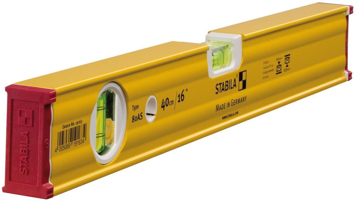 STABILA Poziomica Typ80AS, 40cm Poziomice STABILA Typ80AS to proste, dokładne i wytrzymałe poziomice. Zbudowane z wzmacnianego aluminium Typ80AS wraz z technologią montażu STABILA niezmienną dokładność przez wiele lat użytkowania. Poziomice STABILA świetnie spełniają swoje zadanie. Cechy poziomicy: Wzmacniany, aluminiowy profil Nakładki antypoślizgowe ułatwiające pracy przy znakowaniu Technologia instalacji STABILA zapewniająca stałą dokładność przez wiele lat użytkowania; w normalnej pozycji +/- 0,5 mm/m, w odwróconej pozycji +/- 0,75 mm/m Wysokiej jakości libele STABILA ze szkła akrylowego oraz z fluorescencyjnym płynem zapewniają łatwy odczyt pomiaru Nakładki chroniące poziomice przed upadkami Łatwe w utrzymaniu czystości, dzięki zastosowaniu elektrostatycznej powłoki 1 pozioma libela, 1 pionowa libela, 2 powlekane powierzchnie pomiarowe