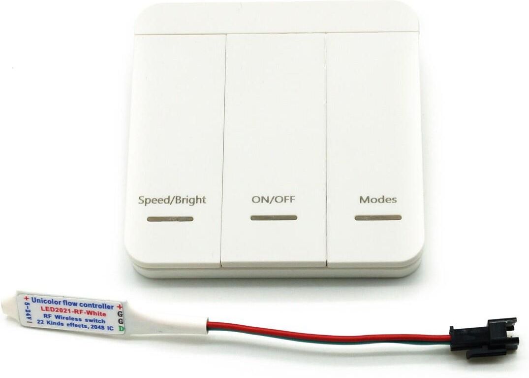 Sterownik i panel jest łatwy w instalacji i prosty w obsłudze. Panel jest bezprzewodowy, baterie montujemy pod środkowym klawiszem panelu. Podłączamy do zasilacza V+ i V- z taśmy LED a Sterownik podłączamy do wtyczki PIN przy taśmie LED. Przyciski panelu Pierwszy przycisk- regulacja prędkości i regulacja jasności (funkcja regulacji prędkości, gdy światło jest włączone, a funkcja regulacji jasności, gdy światło jest wyłączone) Drugi przycisk- włącz/wyłącz światło Trzeci przycisk- zmiana trybu efektu Tryb fabryczny- naciśnięcie jednocześnie przycisku 1 i 3, gdy światło jest włączone przywróci domyślny tryb fabryczny Napięcie wejściowe: 5-24V DC Liczba punktów kontrolnych: maksymalnie może kontrolować 3200 układów scalonych Zasięg panelu: 20m Zasilanie panelu: 1x 23A Montaż panelu: możliwość montażu na ścianie (kołki montażowe lub taśma dwustronnie klejąca) Stopień ochrony: IP20 Tryb efektów: 23 rodzaje Obsługuje taśmy LED: Cyfrowe jednokolorowe Wymiary: panelu - 86 x 86 x 13 mm ; sterownika - 50 x 13 x 6 mm Regulacja ilości punktów kontrolera Gdy światło jest wyłączone, naciśnij i przytrzymaj przycisk „Modes" przez 5 sekund, aby wejść do menu regulacji ilości punktów. Przycisk „Speed/Bright" jest do dodawania punktów, a przycisk „Modes" służy do odejmowania punktów. Naciśnij długo, aby szybko dostosować, po regulacji naciśnij przycisk "ON/OFF", aby zapisać i wyjść. Domyślnie fabrycznie jest 80 układów scalonych, a maksimum można ustawić do 3200 układów scalonych.Jeśli w tym samym czasie używanych jest wiele kontrolerów i nie chcemy, aby ich przełączniki kolidowały ze sobą, konieczne jest, aby kontroler nauczył się odpowiednich przełączników. Kodowanie Najpierw odłączamy zasilanie od kontroler, to znaczy odłączamy zasilanie od zasilacza, a kontroler i taśma LED zgaśnie. Naciśnij i przytrzymaj przycisk „Modes", a następnie podłącz zasilanie do kontrolera, a taśma LED za miga trzy razy szybko, aby pomyślnie nauczyć się kodu. W tej chwili tylko kodowane przełączniki mogą sterować kontrolerem. Jeden kontroler może nauczyć się sześciu przełączników.Jeżeli chcesz skasować kod i wznowić sterowanie wszystkimi pilotami. Rozkodowywanie Najpierw odłączamy zasilanie od kontroler, to znaczy odłączamy zasilanie od zasilacza, a kontroler i taśma LED zgaśnie. Naciśnij i przytrzymaj przycisk „Speed/Bright", a następnie podłącz zasilanie do kontrolera, a taśma LED za miga trzy razy wolno, a wszystkie przełączniki zostaną przywrócone do normalnego stanu kodu. W przypadku "pojedynczego otwartego przełącznika" dostępna jest tylko funkcja kodowania uczenia się, a kontrolera nie można wyczyścić.Metoda ustawienia "pojedynczy kanał przepływu wody (1 układ scalony podzielony na 3 kanały)" lub "pojedynczy przepływ wody (jeden układ scalony)": pojedynczy przepływ wody (jeden układ scalony): maksymalnie może kontrolować 3200 układów scalonych 400 metrów, efekt płynącej wody nie jest tak miękki (ustawienie fabryczne przepływ wody dla pojedynczego układu scalonego). pojedynczy kanał przepływu wody (jeden układ scalonych jest podzielony na 3 kanały): maksymalnie może kontrolować 3200 kanałów czyli 1066 układów scalonych (jeden układ scalony trzy kanały) to 133 metry, a efekt bieżącej wody jest bardzo delikatny i miękki (trzeba dostosować kolejność kanałów RGB). Jeden układ scalony = 15 diod = 3 kanały Jeden kanał = 5 diod = 1/3 układu scalonego Metoda regulacji Gdy lampka jest włączona, naciśnij i przytrzymaj „Modes" przez 10 sekund, aż taśma LED zamiga dwa razy, aby wejść do menu regulacji sekwencji kanałów. W tym momencie naciśnij „Speed/Bright", aby wyregulować sekwencję kanałów, a 12 punktów na taśmie LED pokaże efekt pojedynczego przepływu wody, jeśli kanał jest prawidłowo wyregulowany, diody LED będą płynąć sekwencyjnie od pierwszego punktu do 12 punktu, jeśli kanał nie jest prawidłowo wyregulowany, diody LED będą się krzyżować i płynąć nieregularnie. Po dostosowaniu prawidłowej sekwencji kanałów naciśnij przycisk „ON/OFF”, aby zapisać i wyjść. W sumie jest 7 sekwencji, a mianowicie: pojedynczy kanał układu scalonego, 2. RGB, 3. RBG, 4. GRB, 5. GBR, 6. BRG, 7. BGR poprawna sekwencja kanałów musi zostać dostosowana, aby działała poprawnie.