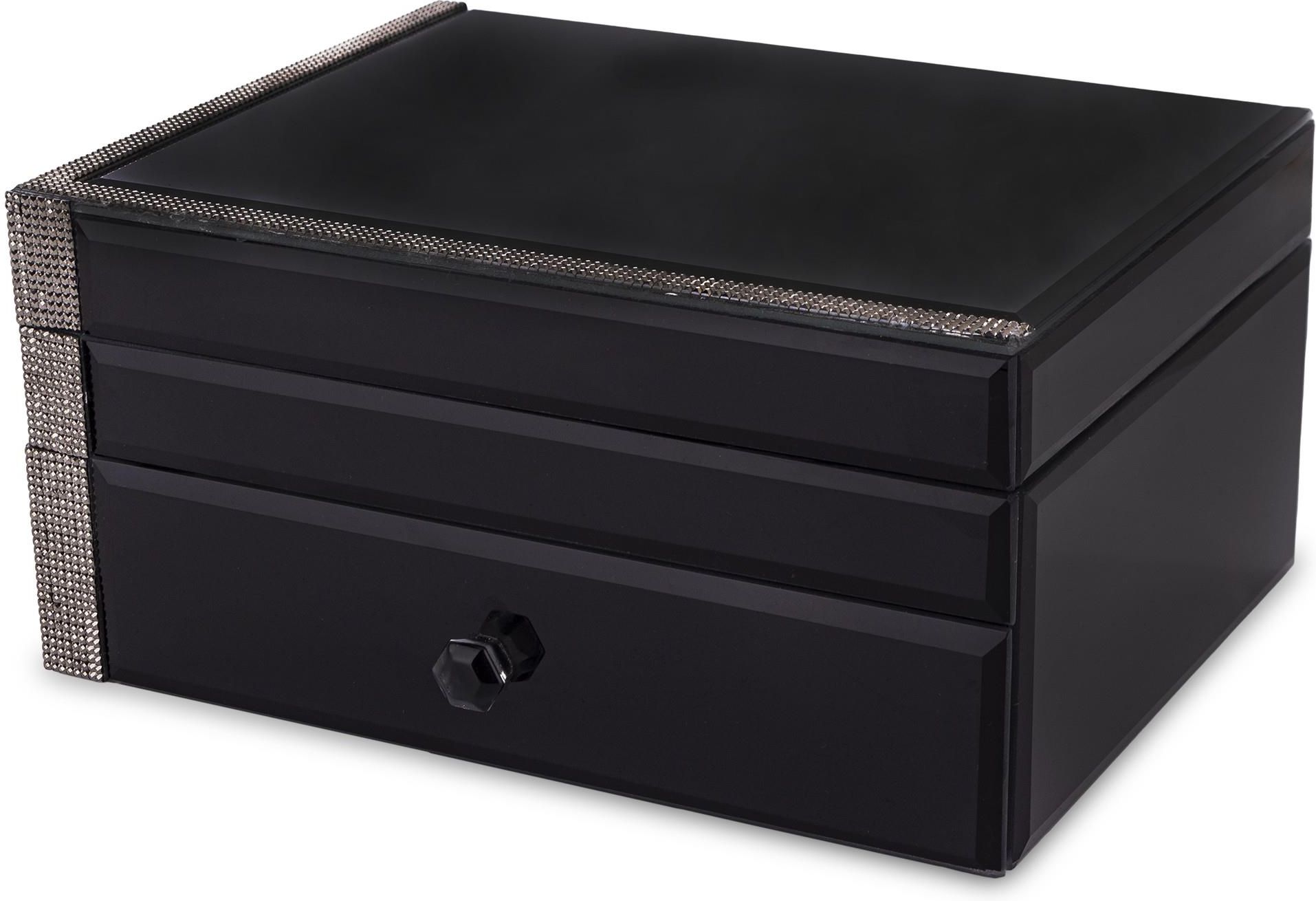 Szkatułka Na Biżuterię Szkatułki, Ramki i Tace / Kolekcja Vetrario Rozmiar: 11x22x17cm Pakowanie: 6/1 Waga: 1.82 kg Materiał: mdf, szkło Kolor: czarny, srebrny