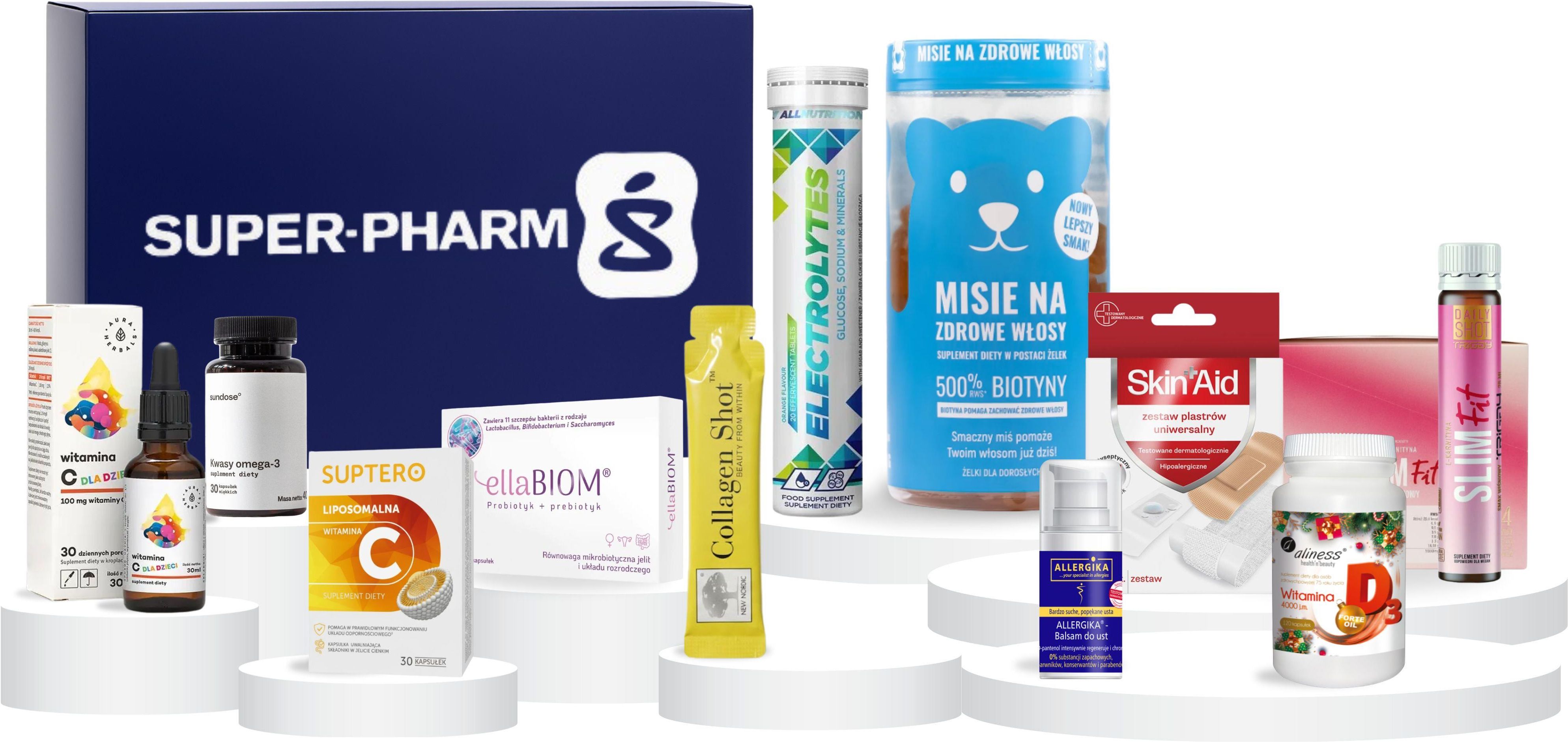 SuperBox dla Superwomen - Odkryj Pełnię Kobiecego Wsparcia! Witaj w świecie SuperBox dla Superwomen – starannie dobranej kolekcji produktów, które wspierają Cię od wewnątrz i na zewnątrz. Od budowania odporności, przez wsparcie piękna, aż po szybką pomoc w drobnych problemach – ten zestaw to Twój klucz do kompleksowej dbałości o siebie, zaprojektowany z myślą o dynamice życia nowoczesnej Superwoman! 1. Ellabiom probiotyk + prebiotyk, kapsułki 10 szt. Specjalistyczny suplement dla kobiet zawierający aż 11 szczepów bakterii oraz prebiotyk (FOS). Wzmacnia naturalną mikroflorę organizmu, pomagając w zapobieganiu nawracającym infekcjom intymnym oraz odbudowie flory bakteryjnej po antybiotykoterapii. Odporny na sok żołądkowy, zapewnia skuteczne wsparcie zdrowia jelit i układu rozrodczego. Zalecane dzienne spożycie: osoby dorosłe i dzieci powyżej 6 r.ż - 1 kapsułka dziennie. Kapsułkę połknąć i popić wodą. 2. Sundose Kwasy Omega-3 Słoik, kapsułki miękkie 30 szt. Niezbędny element dla zdrowia serca, mózgu i wzroku. Kwasy Omega-3 (EPA i DHA) wspierają prawidłowe funkcjonowanie układu krążenia, poprawiają koncentrację i pomagają w utrzymaniu równowagi hormonalno-zapalnej w organizmie. Czysta formuła bez zbędnych dodatków. Zalecane dzienne spożycie: 1 kapsułka dziennie, popijając wodą. 3. Suptero Liposomalna Witamina C 500 mg Kapsułki 30 szt. Witamina C w innowacyjnej, liposomalnej formie, która zapewnia lepszą biodostępność i skuteczniejsze wchłanianie. Wspiera układ odpornościowy i nerwowy, pomaga w produkcji kolagenu oraz chroni komórki przed stresem oksydacyjnym, redukując uczucie zmęczenia. Zalecane dzienne spożycie: Dorośli: 1 -2 kapsułki dziennie. 4. Aliness Witamina D3, 4000 j.m. 120 szt. Wysoka dawka naturalnej witaminy D3 (4000 j.m.) rozpuszczona w oliwie z oliwek, co zwiększa jej przyswajanie. Kluczowa dla silnej odporności, utrzymania zdrowych kości i zębów oraz prawidłowej pracy mięśni. Niezbędna, zwłaszcza w okresach ograniczonej ekspozycji na słońce. Zalecane dzienne spożycie: Dorośli: 1 -2 kapsułki dziennie. Uroda i pielęgnacja 5. Noble Health Misie Na Zdrowe Włosy żelki 300 g Pyszny sposób na piękne włosy! Żelki w kształcie misiów o pomarańczowym smaku, zawierające biotynę, cynk i selen, które pomagają zachować zdrowe włosy i skórę. Witamina E i mangan wspierają ochronę komórek przed stresem oksydacyjnym. Troska o włosy nigdy nie była tak przyjemna! Zalecane dzienne spożycie: 2 żelki dziennie. Nie należy przekraczać porcji zalecanej do spożycia w ciągu dnia. 6. New Nordic Collagen Shot 1 saszetka Płynny shot piękności z hydrolizowanym kolagenem morskim i witaminą C. Gotowa do spożycia saszetka o smaku jagodowym, która wspiera elastyczność skóry, pomaga zredukować widoczność zmarszczek i wspomaga prawidłową produkcję kolagenu. Zalecane dzienne spożycie: 1 saszetka dziennie. Otworzyć odrywając krawędź, spożyć doustnie prosto z saszetki. Nawodnienie i ochrona 7. Allnutrition Electrolytes Orange Tabletki musujące 20 tabletek Musujące tabletki o smaku pomarańczowym, stworzone do uzupełniania elektrolitów (sód, potas, magnez, wapń) utraconych podczas wysiłku fizycznego lub w upalne dni. Pomagają w utrzymaniu odpowiedniego poziomu nawodnienia organizmu, wspierają prawidłowe funkcjonowanie mięśni i zmniejszają uczucie zmęczenia. Zalecane dzienne spożycie: 1 tabletkę rozpuścić w 200ml wody. Stosować dwa razy dziennie. 8. Allergika Balsam do ust 15 ml Intensywnie natłuszczający balsam do ust (32% lipidów), idealny do pielęgnacji suchych, popękanych i wrażliwych ust, również z tendencją do atopii. D-pantenol i alantoina łagodzą podrażnienia i wspierają regenerację. Chroni usta przed wiatrem, mrozem i suchym powietrzem. 9. Aura Herbals, Witamina C dla dzieci 100 mg, Krople doustne 30 ml Witamina C w kroplach o prostym składzie (Clean Label), stworzona z myślą o najmłodszych. Wygodna aplikacja, idealna do dodawania do napojów. Wspiera prawidłowe funkcjonowanie układu odpornościowego i nerwowego u dzieci. Zalecane dzienne spożycie: 20 kropli odmierzyć na łyżeczce i spożyć bezpośrednio lub dodać do zimnego posiłku, np. do sałatki. Przed użyciem mocno wstrząsnąć. 10. Skin Aid Zestaw plastrów uniwersalnych 24 szt. Niezbędny element każdej apteczki. Zestaw plastrów różnego typu (elastyczne, wodoodporne), z antyseptycznym opatrunkiem z dodatkiem chlorheksydyny, który chroni rany i skaleczenia przed ryzykiem infekcji i wspomaga gojenie. Idealne dla skóry wrażliwej. 11. Triggy Vitamin Shot Slim Fit opakowanie 14x25 ml Innowacyjny shot o smaku wiśniowym, stworzony, by wspierać proces spalania tkanki tłuszczowej, szczególnie przy wysiłku fizycznym. Koncentrat zawiera wysoką dawkę L-karnityny, która pomaga w transporcie kwasów tłuszczowych do mitochondriów, gdzie są one przekształcane w energię. Płynna forma zapewnia szybkie wchłanianie i wygodę stosowania przed treningiem lub przed śniadaniem. Idealne wsparcie w drodze do wymarzonej sylwetki Zalecane dzienne spożycie: Ampułkę (25 ml) spożywać raz dziennie, bezpośrednio lub po rozcieńczeniu w wodzie. Wstrząsnąć przed spożyciem. Składniki Ellabiom probiotyk + prebiotyk, kapsułki 10 szt.: 2 x 10^9 CFU L.acidophilus, 1, 5 x 10^9 CFU L.gasseri, 2 x 10^9 CFU L.rhamnosus, 2 x 10^9 CFU L.crispatus, 2 x 10^9 CFU L.jensenii, 2 x 10^9 CFU L.iners, 2 x 10^9 CFU L.plantarum, 2 x 10^9 CFU L.fermentum, 2 x 10^9 CFU Saccharomyces Boulardii, 2 x 10^9 CFU Bifidobacterium lactis, 2 x 10^9 CFU Bifidobacterium bifidum, celuloza mikrokrystaliczna – substancja wypełniająca, hypromeloza (kapsułka), fruktooligosacharydy, Stearynian magnezu – substancja przeciwzbrylająca Słoik Sundose Omega-3 Acids, 30 kapsułek miękkich: Olej rybi 2000 mg, w tym: kwas eikozapentaenowy 660 mg EPA, kwas dokozaheksaenowy 440 mg DHA Balsam do ust All