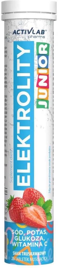 Activlab Pharma Elektrolity Junior to suplement diety w tabletkach musujących. Specjalnie opracowana formuła elektrolitów dla dzieci od 3 roku życia. Zawiera sód i potas, glukozę, a także wapń i witaminę C. O truskawkowym smaku. Skład: Wielkość opakowania: 20 tabletek musujących Porcja jednorazowa: 1 tabletka Ilość porcji w opakowaniu: 20 Składniki1 tabletkaRWS3 tabletkiRWSGlukoza400 mg1200 mgSód264 mg792 mgPotas100 mg5%300 mg15%Wapń40 mg5%120 mg15%Witamina C60 mg75%180 mg225% RWS - Dzienna referencyjna wartość spożycia Nie ustalono dziennej referencyjnej wartości spożycia Składniki: Regulator kwasowości: kwas cytrynowy, diwęglan sodu, substancja wypełniająca: sorbitol, glukoza, diwęglan potasu, aromat, węglan wapnia, koncentrat buraka czerwonego, kwas L-askorbinowy, substancja przeciwzbrylająca: glikol polietylenowy, substancja słodząca: sukraloza. Produkt może zawierać pochodne: zbóż zawierających gluten, soi, mleka. Sposób użycia: 1 tabletkę rozpuścić w 200 ml wody. Stosować 3 tabletki dziennie. Przeciwwskazania: Nadwrażliwość na którykolwiek ze składników preparatu. W okresie ciąży i karmienia piersią przed zastosowaniem należy skonsultować się z lekarzem lub farmaceutą. Przechowywanie: Przechowywać w suchym i ciemnym miejscu, w temperaturze 0-25ºC, w sposób niedostępny dla małych dzieci. Informacja: Produkt nie może być stosowany jako substytut (zamiennik) prawidłowo zróżnicowanej diety. Zrównoważony sposób żywienia i prawidłowy tryb życia jest ważny dla funkcjonowania organizmu człowieka. Nie należy przekraczać maksymalnej zalecanej porcji do spożycia w ciągu dnia.