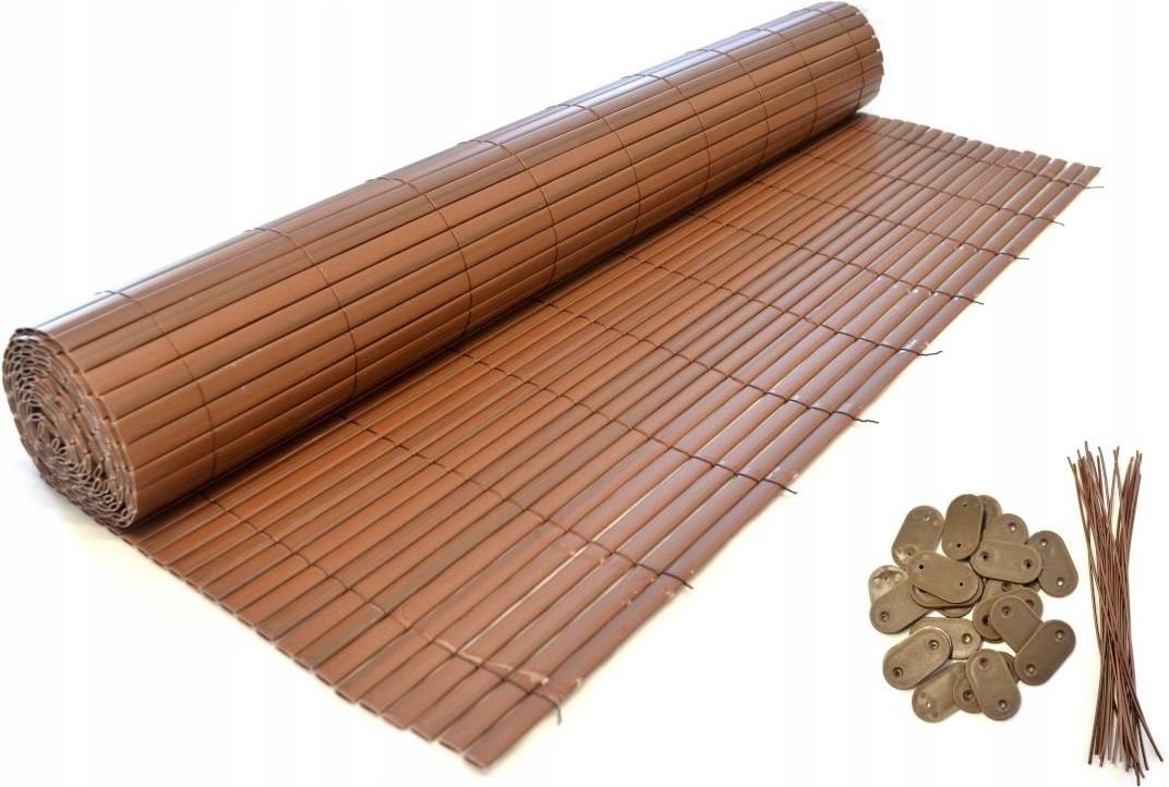 DWUSTRONNA MATA OSŁONOWA Z PCV 0,9x3 m KOLOR : brąz + GRATIS ZESTAW MONTAŻOWY Maty z tworzywa sztucznego charakteryzuje wysoka odporność na warunki atmosferyczne. Sprawdzą się świetnie na balkonach, tarasach i ogrodzeniach. W porównaniu z matami z surowców naturalnych wyglądają "idealnie" , wszystkie listewki są identyczne, gęsto ułożone. W naszej ofercie znajdą Państwo maty z listewek PCV w kolorach : ZIELEŃ, BRĄZ, BAMBUS i ANTRACYT Dostępne rozmiary: 0,8 x 3m, 0,9 x 3m, 1 x 3m, 1 x 5m, 1,2 x 3m, 1,5 x 3m , 1,8 x 3m , 2 x 3m. Zdjęcia na naszych aukcjach są zrobione przez nas, naszym produktom. W ofercie posiadamy również maty z surowców naturalnych : wikliny, trzciny i bambusa. Charakterystyka: Listewki 13 mm x 4 mm (elipsy) , grubość tworzywa 0,4 mm Wiązane co 10 cm, gęstość 1,35 kg/m2 Do każdej maty dodajemy gratis zestawy klipsów montażowych w ilościach odpowiednich do wysokości maty: 80-100 cm - 22 klipsy 120 - 150 cm - 33 klipsy 180 - 200 cm - 44 klipsy