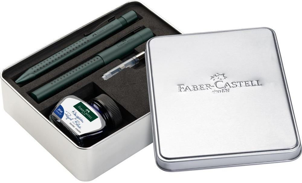 Zestaw prezentowy Faber-Castell z piórem wiecznym, konwerterem, atramentem 30 ml i długopisem z limitowanej edycji Grip 2011 w kolorze Mistletoe w metalowym, atrakcyjnym opakowaniu dopasowanym kolorystycznie do zawartości. Wyjątkowy i nowoczesny design z matowym wykończeniem. Zawiera: Pióro wieczne z opatentowaną strefą GRIP z małymi antypoślizgowymi punktami (3D) w kolorze czarnym dla zapewnienia pewnego uchwytu i komfortu pisania. Wyposażony w solidny i elastyczny metalowy klips oraz dopracowaną, wytrzymałą czarną stalówkę w rozmiarze M z irydową końcówką o idealnym przepływie atramentu. Ergonomiczna, antypoślizgowa strefa uchwytu i idealne wyważenie, zarówno bez, jak i ze skuwką, zapewniają doskonałe wrażenia podczas pisania. Długopis z opatentowaną strefą GRIP z małymi antypoślizgowymi punktami (3D) w kolorze czarnym dla zapewnienia pewnego uchwytu i komfortu pisania. Wyposażony w solidny i elastyczny metalowy klips, przyciskowy mechanizm oraz wkład o dużej pojemności, z możliwością wymiany. Ergonomiczna, antypoślizgowa strefa uchwytu i doskonałe wyważenie zapewniają doskonałe wrażenia podczas pisania. Idealny do wypełniania dokumentów. Końcówka pisząca w rozmiarze XB. Kolor tuszu: niebieski.