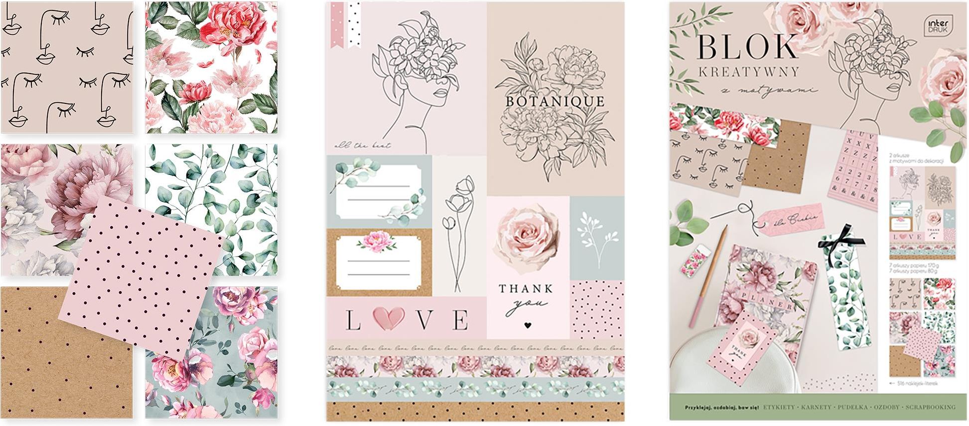 Blok kreatywny zawiera: 516 naklejek z literkami, 2 arkusze z motywami dekoracyjnymi, 7 arkuszy papieru z motywami 170g, 7 arkuszy papieru z motywami 80g. Idealnie sprawdzi się w różnych pracach plastycznych, umożliwiając wykonanie własnych etykiet, karnetów, pudełek, ozdób czy scrapbookingu.