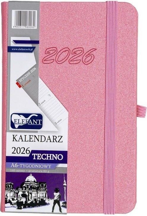 Kalendarz 2026 A6 tygodniowy Techno, różowy Kalendarz wykonany jest z trwałych materiałów. Szczegóły: • zamykany na gumkę w kolorze oprawy, • gumka na długopis w kolorze oprawy, • brzegi kalendarza z kolekcji Techno są w kolorze kremowym, • zaokrąglone narożniki opraw i stron, • tasiemka w kolorze …
