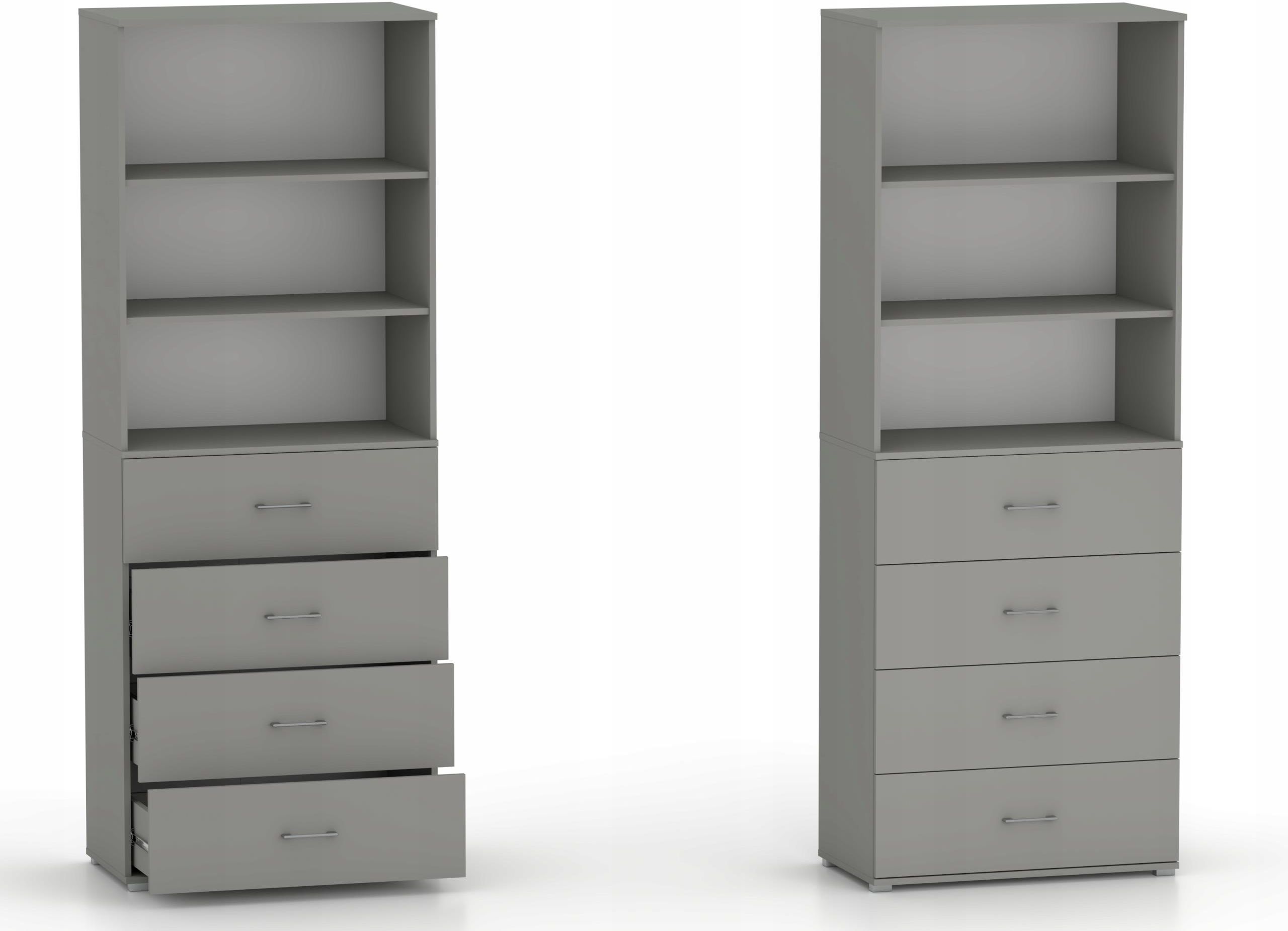 Regał biurowy z szufladami 215 RELIC 4S3P szary 60 cm Regał z serii RELIC przyda się w nowoczesnym, jak i klasycznym wnętrzu biura, salonu, sypialni czy pokoju młodzieżowego. Rozwiązanie to dedykowano osobom, które cenią sobie prostotę i elegancję. Bryła charakteryzuje się prostą minimalistyczną formą, która została wykonana z trwałych materiałów zapewniających jej bezpieczeństwo oraz wygodę użytkowania przez długie lata. Ergonomiczne wymiary regału zapewniają swobodę w umeblowaniu dowolnego pomieszczenia. Cechy charakterystyczne nowoczesne wzornictwo podwyższona odporność na uszkodzenia funkcjonalne szuflady modna kolorystyka możliwość montażu regału bez nóżek Mebel pakowany w częściach do samodzielnego montażu wraz z czytelną instrukcją i akcesoriami montażowymi. Wymiary regału Szerokość: 60 cm Głębokość: 40 cm Wysokość: 215 cm Wnętrze Regał posiada trzy półki, które pomogą przechować i wyeksponować kolekcję książek, albumy ze zdjęciami lub ulubione bibeloty. Dolną część zajmują cztery szuflady, w których można z łatwością ułożyć teczki na dokumenty, płyty z muzyką czy inne niezbędne przedmioty. Szuflady zostały zamontowane na solidnych prowadnicach kulkowych z pełnym wysuwem, które znacząco podnoszą komfort korzystania z mebla. Wymiary szuflady Szerokość: 51 cm Głębokość: 33 cm Wysokość frontu: 25,5 cm Wysokość boczku: 16 cm Maksymalna wysokość przedmiotu, który zmieści się w szufladzie: 21 cm Wykończenie Korpus oraz fronty skonstruowano z wysokiej jakości płyty laminowanej producenta Kronopol w kolorze szary platynowy o grubości 16 mm. Dodatkowym zabezpieczeniem jest obrzeże PCV chroniące krawędzie płyty przed zarysowaniem i wilgocią. Prostokątne stopki z tworzywa sztucznego dają odpowiednie podparcie dla całej bryły.