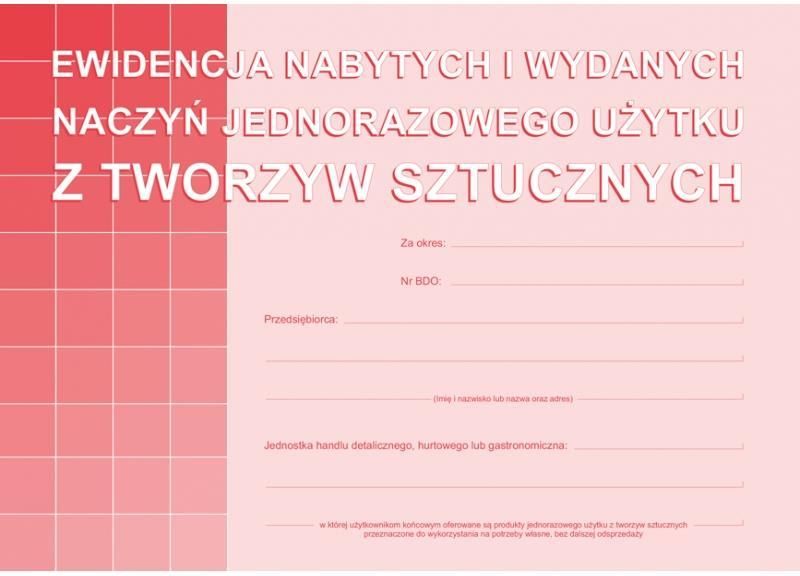 Ewidencja nabytych i wydanych naczyń jednorazowego użytku z tworzyw sztucznych Druk: offsetowy Format: A5 album Objętość: 32 strony Obowiązek prowadzenia ewidencji wynika z art. 3h ustawy z dnia 11 maja 2001 r. o obowiązkach przedsiębiorców w zakresie gospodarowania niektórymi odpadami oraz o opłacie produktowej (Dz. U. t.j. z 2020 r., poz. 1903.). Przedsiębiorca prowadzący jednostkę handlu detalicznego, jednostkę handlu hurtowego lub jednostkę gastronomiczną, w których są oferowane: - produkty jednorazowego użytku z tworzyw sztucznych będące opakowaniami, lub - napoje lub żywność pakowane przez tego przedsiębiorcę w naczynia jednorazowego użytku z tworzyw sztucznych, jest obowiązany do pobrania opłaty od użytkownika końcowego nabywającego te produkty lub napoje lub żywność w tych naczyniach. Do pobrania opłaty jest również obowiązany przedsiębiorca pakujący i oferujący za pomocą urządzenia vendingowego, w tym umieszczonego także w miejscach innych niż jednostki handlu lub jednostki gastronomiczne napoje lub żywność w produktach jednorazowego użytku z tworzyw sztucznych będących opakowaniami. Wymienieni wyżej przedsiębiorcy są obowiązani do prowadzenia, w postaci papierowej albo elektronicznej, ewidencji liczby nabytych i wydanych użytkownikom końcowym produktów jednorazowego użytku z tworzyw sztucznych będących opakowaniami w danym roku kalendarzowym. Przedsiębiorca prowadzący więcej niż jedną jednostkę handlu detalicznego, jednostkę handlu hurtowego lub jednostkę gastronomiczną, prowadzi ewidencję oddzielnie dla poszczególnych jednostek. Przez użytkownika końcowego rozumie się osobę (podmiot) nabywający produkty jednorazowego użytku z tworzyw sztucznych, opakowania jednorazowego użytku z tworzyw sztucznych lub napoje, lub żywność w opakowaniach jednorazowego użytku z tworzyw sztucznych w celu ich wykorzystania na potrzeby własne, bez dalszej odsprzedaży. Rozporządzenie Ministra Klimatu i Środowiska z dnia 7 grudnia 2023 r. w spra - wie stawek opłaty za produkty jednorazowego użytku z tworzyw sztucznych będące opakowaniami (Dz. U. z 2023 r., poz. 2679) określa stawki tej opłaty w wysokości: 20 groszy za każdy jednorazowy kubek z tworzyw sztucznych, 25 groszy za każdy pojemnik jednorazowy z tworzyw sztucznych, w którym podawana jest żywność na wynos, gotowa do bezpośredniego spożycia bez dodatkowego przygotowania