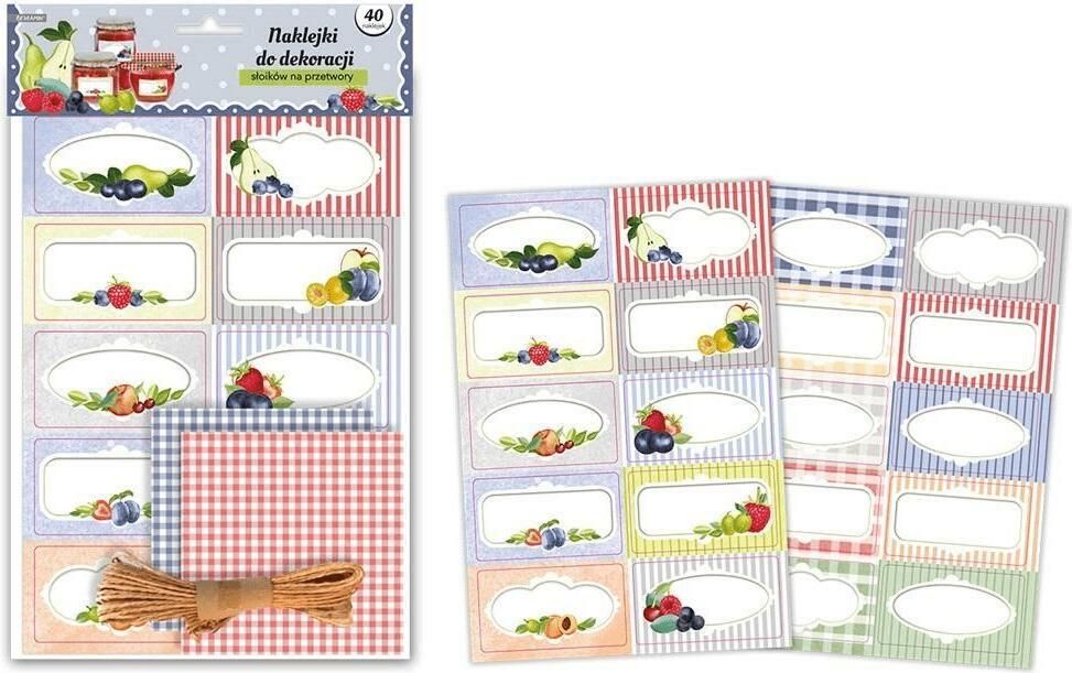 Naklejki na przetwory B4/4K Naklejki na przetwory B4/4K Zestaw zawiera 40 prostokątnych naklejek/etykiek do dekoracji słoików na przetwory. Na każdej naklejce miejsce na wpisanie nazwy. Dodatkowo znajduje się tam 10 krawatek i 6m naturalnej rafii Naklejki na przetwory B4/4K OKAZJA! Spradź inne nasze ofety!
