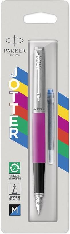 Pióro wieczne Parker Jotter stało się symbolem marki, to najbardziej rozpoznawalna i chętnie wybierana seria. Już od wielu lat zachwycają swoim wyglądem, są idealnie dopasowane do ręki, trwałe i idealnie nadają się zarówno dla kobiety jak i mężczyzny. Kolekcję piór wiecznych Parker Jotter cechuje: nowy klips w kształcie strzałki zaokrąglony pierścień potrójna strzałka wygrawerowana na stalówce. Dodano także potrójny pierścień na dolnej części korpusu pióra, który idealnie pasuje do całości.Pióro Parker Jotter świetnie sprawdzi się zarówno dla osób ceniących wygodę i wysoką jakość, jak i dla nowych, mniej doświadczonych użytkowników, którzy pragną doświadczyć przyjemnych doznań płynących z pisania. Zarówno skuwka jak i klip wykonane zostały z polerowanej stali nierdzewnej. Część przednia pióra to czarne tworzywo sztuczne, stalówka wykonana jest ze stali, grubość pisania M (medium).