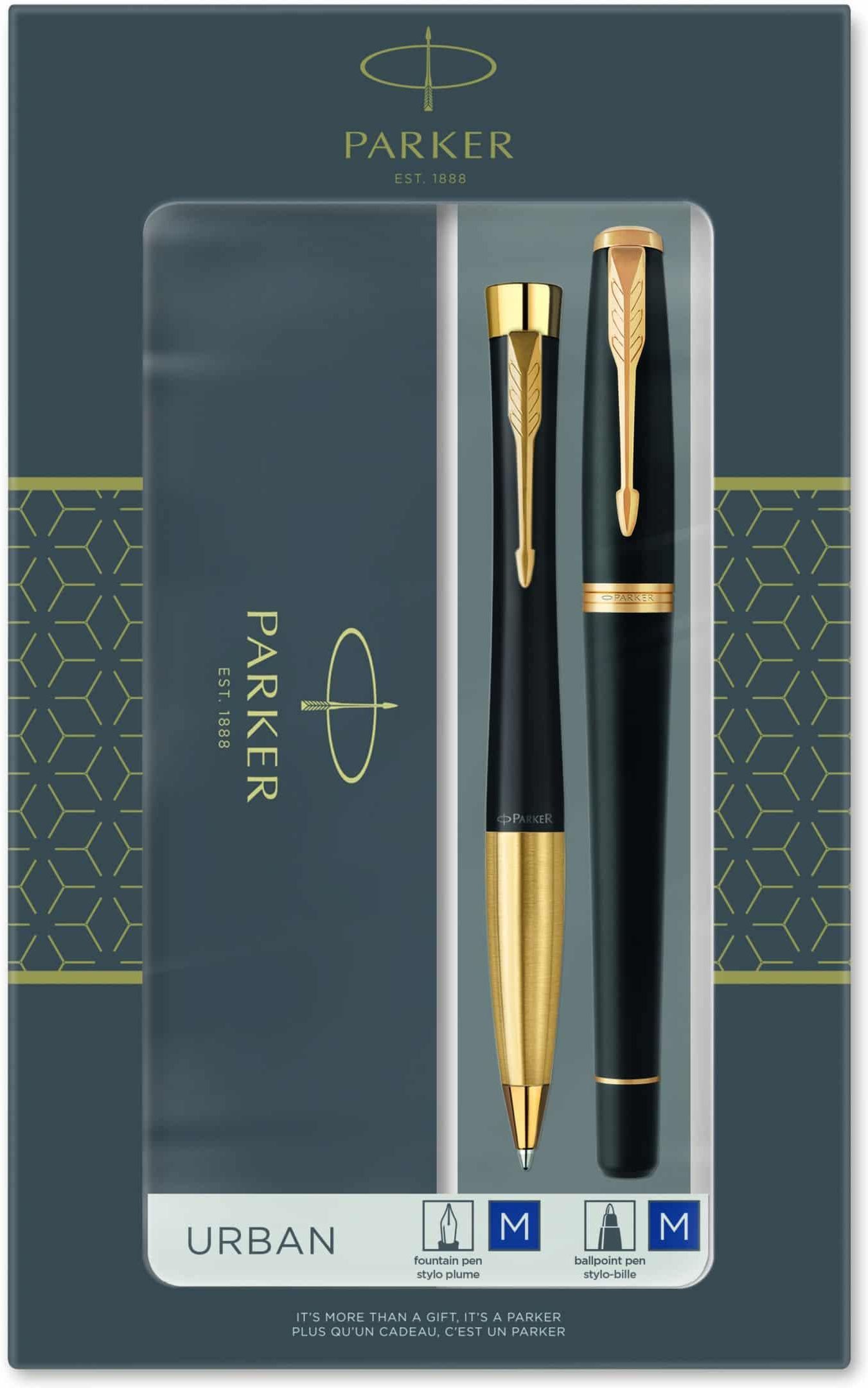 Zestaw zawiera długopis i pióro wieczne Urban w wyróżniającym opakowaniu prezentowym - doskonałe do reprezentacyjnych zadań i ważnych dokumentów.Atrakcyjne i dynamiczne, pióra wieczne Urban mają śmiały, nowoczesny wygląd nie do przeoczenia. Ich falująca sylwetka pozwoli cieszyć się doświadczeniem doskonale zrównoważonego pisania, które świetnie dopełni Twój styl. Posiadając złote wykończenia i korpus powleczony matowym, czarny lakierem, zestaw ten będzie niezapomnianym prezentem dla absolwentów, a także doskonałym wyborem przy podpisywaniu ważnych dokumentów i wyjątkowej korespondencji. Zestaw zawiera długopis i pióro wieczne Urban w wyróżniającym opakowaniu prezentowym - doskonałe do reprezentacyjnych zadań i ważnych dokumentów. Sylwetka klepsydry nadaje linii Urban śmiały, nowoczesny wygląd, stworzony, by pasować do Twojego osobistego stylu. Zgaszony, czarny lakier o proszkowej powierzchni ze złotymi wykończeniami i rozpoznawalnym klipem Parker w kształcie strzały. Długopis wyposażony jest w mechanizm obrotowy oraz w niezawodny, niebieski tusz QuinkFlow zapewniający gładkie, równe linie, gdziekolwiek piszesz. Pióro wieczne wyposażone jest w trwałą stalówkę ze stali szlachetnej, zapewniającą doświadczenie pewnego, a zarazem osobistego pisania. Wyposażone jest także w długi nabój z niebieskim atramentem Quink.