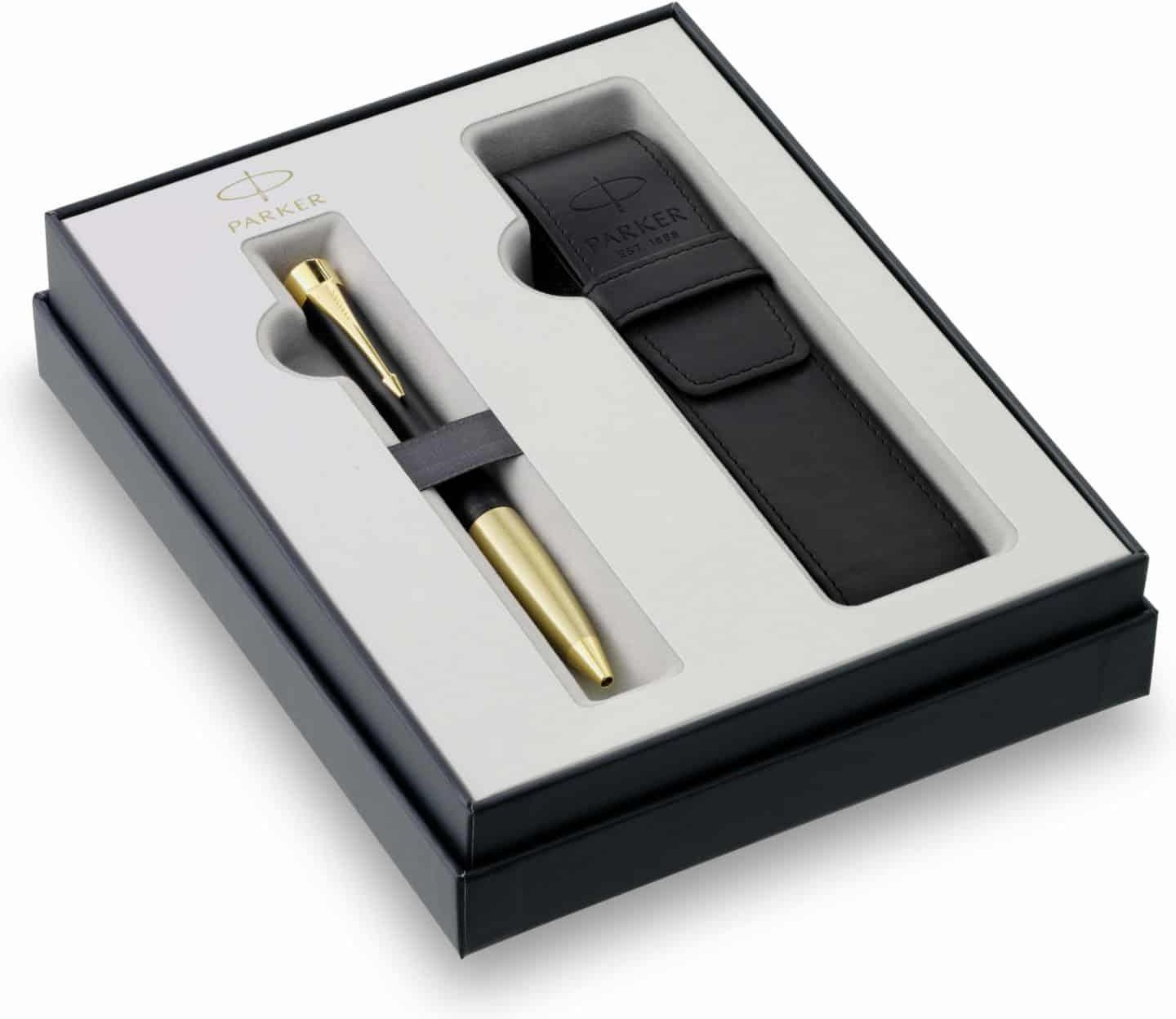 Nowa kolekcja upominków przywodzi na myśli luksus i elegancję. Każde opakowanie prezentowe, odzwierciedlające tożsamość marki, zostało zaprojektowane z pasją i przyciąga wzrok wyjątkowymi zdobieniami. Produkty zostały specjalnie dobrane tak, aby stworzyć prezent idealny na każdą okazję.W tym zestawie znajdziesz długopis i dopasowane czarne etui z PU na długopis zapakowane w klasyczne pudełko upominkowe Parker. Zestaw ten zawiera idealne akcesorium, które pozwala piszącemu zabrać pióro ze sobą. Idealny upominek na każdą okazję. Długopis i dopasowane czarne etui z PU na długopis, zapakowane w klasyczne pudełko upominkowe Parker. Każde opakowanie prezentowe, odzwierciedlające tożsamość marki, zostało zaprojektowane z pasją i przyciąga wzrok wyjątkowymi zdobieniami. Produkty zostały specjalnie dobrane tak, aby stworzyć prezent idealny na każdą okazję. Zestaw ten zawiera eleganckie etui z logo Parker, które pozwala piszącemu zabrać długopis ze sobą. Idealny upominek na każdą okazję.