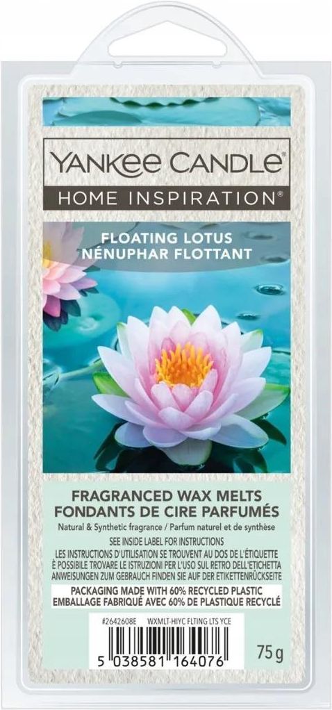 Yankee Candle Wosk Floating Lotus Delikatny, wodno-kwiatowy i niezwykle harmonijny - Yankee Candle Floating Lotus to zapach, który przywodzi na myśl spokojne poranki nad taflą wody i relaksującą ciszę ogrodu zen. Kompozycję otwierają świeże nuty bergamotki, liści cytryny, mandarynki i wody aloesowej. W sercu rozkwitają subtelne kwiaty lotosu, konwalii i białej herbaty, a bazowe akordy piżma, liści fiołka i mchu dodają całości głębi i naturalnej miękkości. To idealny wybór dla osób szukających zapachu, który uspokaja, oczyszcza i tworzy przestrzeń do wyciszenia i relaksu. Doskonale sprawdzi się w sypialni, łazience lub domowym gabinecie. Dlaczego warto wybrać Wosk Yankee Candle Floating Lotus świeża, wodna kompozycja z kwiatowym sercem i kojącą bazą, natychmiastowe uwalnianie zapachu po rozpuszczeniu wosku, idealny do stworzenia atmosfery spokoju i relaksu, doskonały sposób na wypróbowanie nowego aromatu lub mieszanie zapachów. Sposób użycia Umieść kawałek wosku w górnej części kominka zapachowego (tradycyjnego lub elektrycznego). W trakcie podgrzewania wosk zacznie się topić, uwalniając zapach. Nie dodawaj wody. Po zastygnięciu wosk możesz ponownie użyć lub łatwo go wymienić na inny aromat. Pojemność: 75g