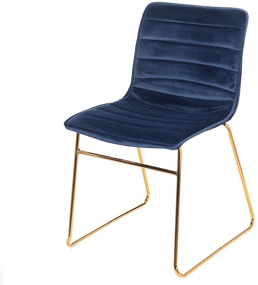 Nowoczesne krzesło tapicerowane w przepięknym granatowym kolorze.Siedzisko krzesła wykonane z tkaniny o aksamitnym wykończeniu. Złote, gięte nóżki dopełniają luksusowy styl mebla efetownie kontrastując z kolorem obicia. Siedzisko urozmaicone zostało eleganckim detalem w postaci poziomych przeszyć, które meblowi wytworności i szyku.Krzesło wspaniale zaprezentuje się w nowoczesnych wnętrzach, gdzie będzie nie tylko funkcjonalnym, ale również stylowym elementem wyposażenia.