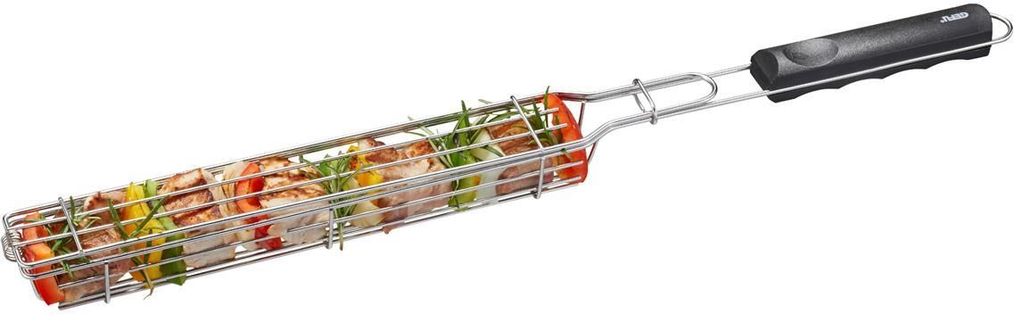 Kosz do grillowania z kolekcji BBQ. Długi. Idealny na szaszłyki, kebaba i warzywa. Łatwe obracanie i smażenie bez przywierania do rusztu. Wykonany ze stali nierdzewnej i tworzywa.