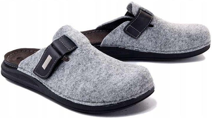 Kapcie męskie. Filcowa cholewka. Skórzana, profilowana wkładka. Zapięcie na rzep. Elastyczna podeszwa.