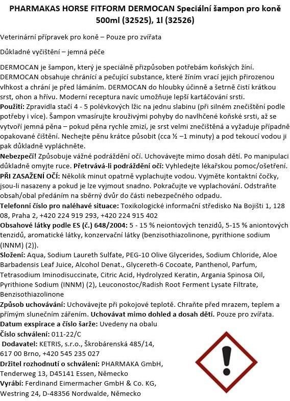 PHARMAKAS Horse fitform DERMOCAN Specjalny szampon dla koni• przenika głęboko do sierści, usuwa zanieczyszczenia i pot, regeneruje sierść i skórę • nadaje sierści piękny, lśniący wygląd dzięki substancjom specjalnie dobranym do sierści koni • ma stopniowe, reaktywujące działanie wspomagające prawidłowy wzrost sierści • z zawartością naturalnego tłoczonego na zimno oleju z pestek winogron DERMOCAN to szampon, który jest specjalnie dostosowany do potrzeb końskiej grzywy. DERMOCAN zawiera substancje ochronne i pielęgnacyjne, które przywracają grzywie jej naturalną wilgotność i chronią przed łamaniem. DERMOCAN skutecznie i delikatnie czyści krótką sierść, ogon i grzywę. Nowoczesna receptura dodatkowo umożliwia lepsze szczotkowanie sierści.Zastosowanie: Zazwyczaj wystarcza 4–5 łyżek stołowych na jedną partię (przy silnym zabrudzeniu odpowiednio więcej). Wmasować szampon kolistymi ruchami w zwilżoną końską sierść aż do uzyskania delikatnej piany – jeśli piana szybko znika, sierść jest bardzo zabrudzona i wymaga ewentualnie ponownego czyszczenia. Pozostawić pianę na krótko (ok. 1–1 minuty), a następnie dokładnie spłukać pod bieżącą wodą.Skład: Aqua, Sodium Laureth Sulfate, PEG-10 Olive Glycerides, Sodium Chloride, Aloe Barbadensis Leaf Juice, Alcohol Denat., Glycereth-6 Cocoate, Panthenol, Parfum, Tetrasodium Iminodisuccinate, Citric Acid, Hydrolyzed Keratin, Argania Spinosa Oil, Pyrithione Sodium (INNM) (2), Leuconostoc/Radish Root Ferment Lysate Filtrate, BenzisothiazolinonePrzechowywanie: Przechowywać w temperaturze pokojowej. Chronić przed mrozem, ciepłem i bezpośrednim działaniem promieni słonecznych. Przechowywać poza zasięgiem i wzrokiem dzieci. Tylko dla zwierząt.Numer zatwierdzenia: 011-22/C