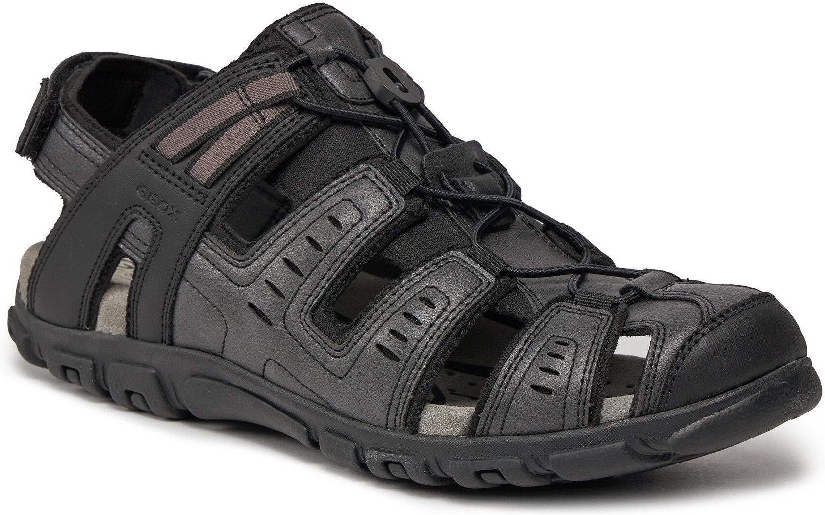 Sandały męskie. Miękka, skórzana, częściowo perforowana wkładka. Zakryte noski. Zapięcie na rzep. Elastyczne sznurowadła ze stoperem. Oddychające podeszwy Geox Respira.