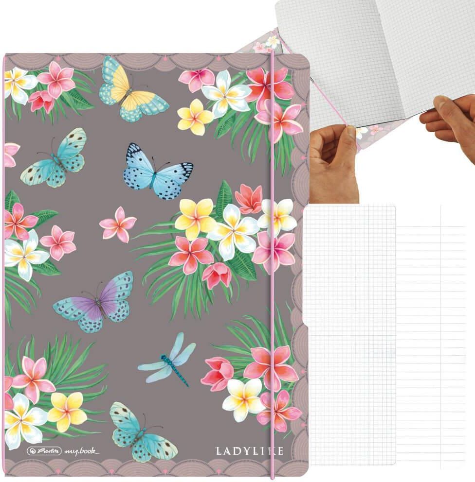 Notatnik szkolny, biurowy Ladylike Butterflies Notes z wytrzymałą okładką wykonaną z polipropylenu PP Formatu A4 z zaokrąglonymi narożnikami i liniaturze w kolorze szarym Wkład w kratkę i linię z szarym marginesem Posiada wymienne, zszywane wkłady: w linię i kratkę, każdy po 40 kartek o gramaturze: …