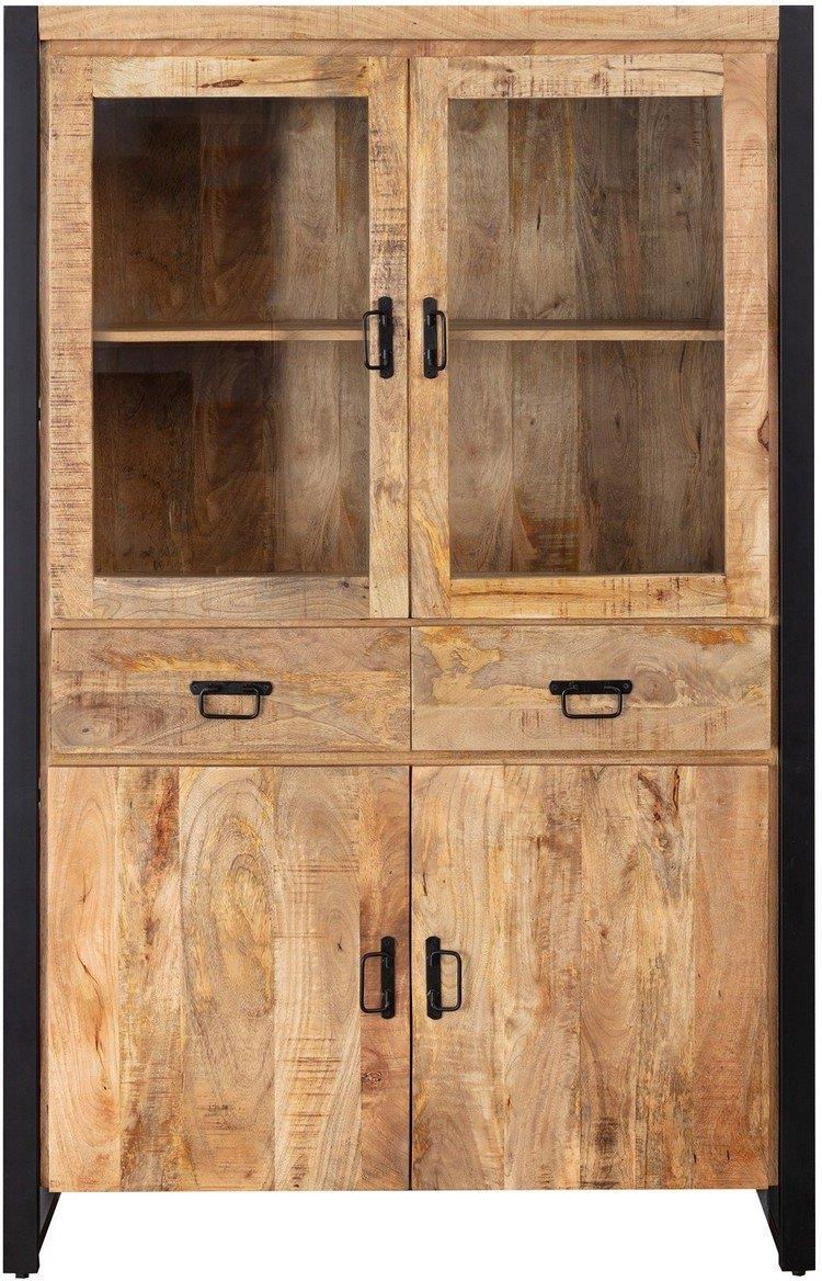 Witryna do salonu z drewna mango na metalowej konstrukcji. Witryna z drewna mango na solidnej metalowej konstrukcji łączy w sobie naturalne piękno drewna z industrialnym urokiem metalu. Ta czterodrzwiowa witryna, dodatkowo wyposażona została w dwie pojemne szuflady. Ten unikatowy mebel zachwyca swoim wyglądem oraz zapewnia znakomity sposób na przechowywanie i wyeksponowanie cennych przedmiotów. Drewno mango, użyte do wykonania witryny, to materiał o wyjątkowej urodzie, charakteryzujący się piękną, naturalną barwą oraz subtelnymi sękami. Niepowtarzalny klimat i ciepło doskonale kontrastuje z surowym stalowym szkieletem, idealnym do wnętrz urządzanych w stylu loft. Metalowa konstrukcja zapewnia stabilność i trwałość, gwarantując, że witryna Frigg będzie służyć przez długie lata. Cztery drzwi witryny otwierają dostęp do przestronnego wnętrza z półkami, które pomieści wiele ulubionych przedmiotów: od książek po zastawę stołową. Dodatkowo dwie szuflady w centralnym punkcie mebla pozwalają na umieszczenie w nich cennych drobiazgów, zachowując porządek. Witryna szklana Frigg jest funkcjonalna, a jednocześnie jest eleganckim elementem dekoracyjnym, który doda uroku każdemu wnętrzu. To połączenie naturalnej estetyki i industrialnego stylu sprawia, że ta witryna przyciąga uwagę i wzbogaca każdą przestrzeń. Nadaj Twojemu wnętrzu w stylu loft indywidualny wyraz i sprawdź inne meble serii Frigg. Wymiary: szer. 115 cm, gł. 45 cm, wys. 182 cm.Materiał: drewno mango / metal. Kolor: naturalny / czarny.