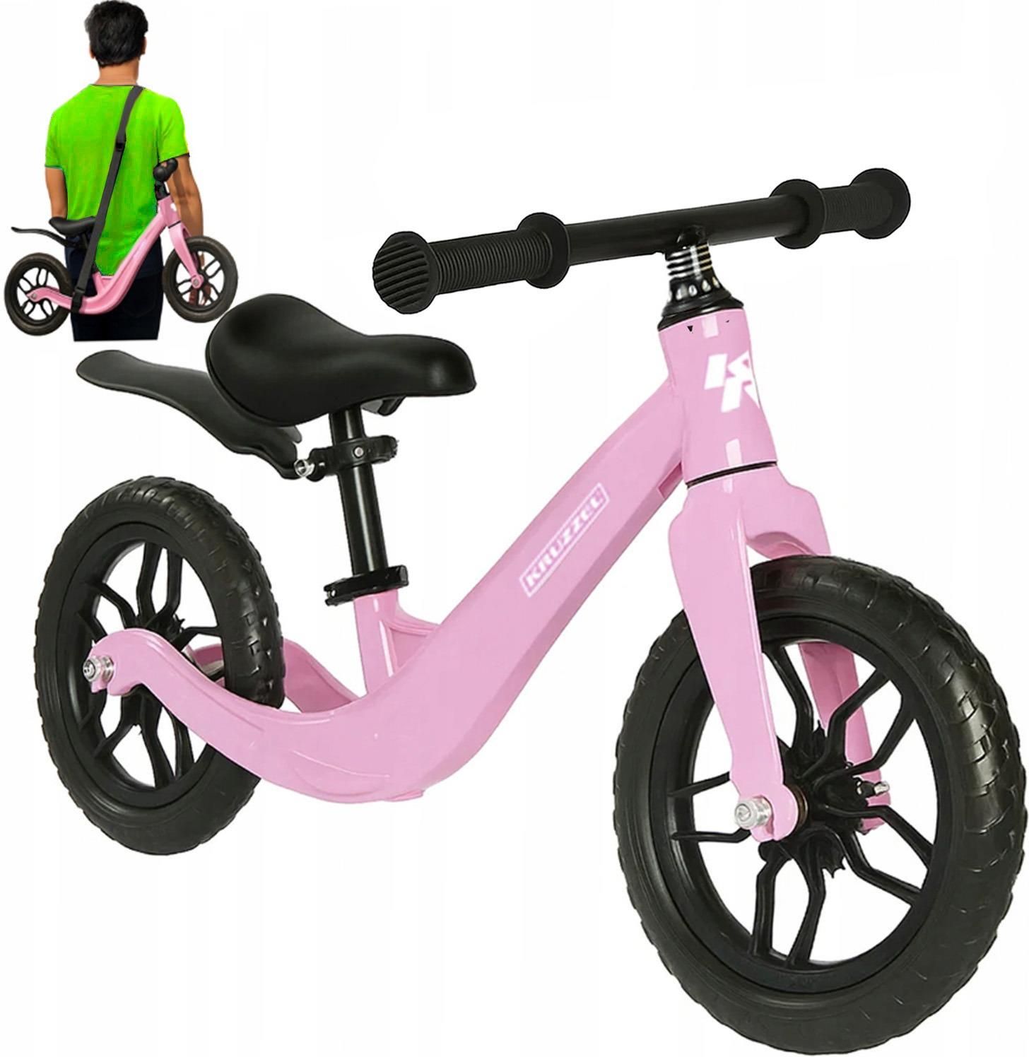 Rowerek biegowy dla dzieci 2+ KRUZZEL rower dziecięcy lekki koła 12" + pasek na ramię różowy! stabilność - antypoślizgowe uchwyty, piankowe koła EVA, regulowana wysokość siedziska, błotnik i solidna rama magnezowa zapewniają stabilność i komfort jazdy prosty montaż - w zestawie znajduje się …