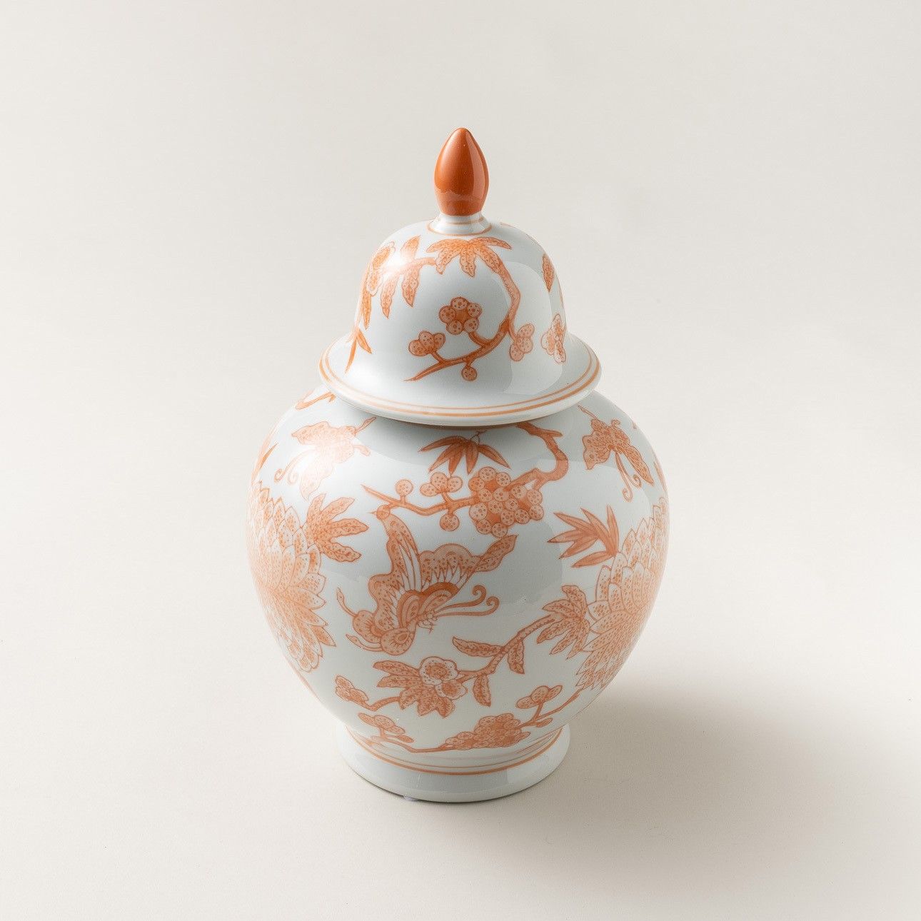 Pojemnik o klasycznej, dekoracyjnej formie z delikatnym, ręcznie malowanym wzorem o ciepłym pomarańczowym odcieniu.Pojemnik porcelanowy Aura to elegancki dodatek, który wnosi do wnętrza lekkość i wyrafinowany styl. Jasne tło w połączeniu z finezyjnymi, roślinnymi motywami tworzy harmonijną kompozycję inspirowaną sztuką orientalną. Ozdobna pokrywka z wydłużonym uchwytem podkreśla jego dekoracyjny charakter i nadaje całości smukłości.Doskonale sprawdzi się jako pojemnik na drobiazgi, słodycze lub biżuterię, a także jako samodzielna ozdoba na komodzie, konsoli czy stole. Ręczne zdobienie nadaje każdemu egzemplarzowi unikalny charakter. Materiał: porcelana ręcznie malowanaKolor: biel i pomarańczWymiary: śr. 21 cm, wys. 33 cmWaga: 2,5 kg