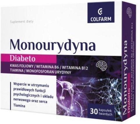 Suplement diety Colfarm, Monourydyna diabeto, 30 kapsułek twardych Wsparcie w utrzymaniu prawidłowych funkcji psychologicznych i układu nerwowego oraz serca Właściwości składników zawiera kwas alfa-liponowy, monofosforan cytodyny, witaminę C, E, B12, B6, D, niacynę, tiaminę, ryboflawinę, kwas …