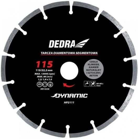 DEDRA Tarcza segmentowa do betonu, cegły, kamienia 110MMx22,2MM HP2110Tarcza segmentowa HP2110 z serii DYNAMIC jest przeznaczona do cięcia betonu, cegły, klinkieru, kamienia naturalnego i sztucznego. Do cięcia na sucho i mokro.Cechy charakterystyczne:Estetyczna krawędź po przecięciu.Do pracy na mokro i sucho.Parametry:Średnica tarczy: 110 mmŚrednica otworu mocującego: 22,2 mmRodzaj tarczy: diamentowaTyp wieńca: segmentowyMaksymalna ilość obrotów: 13000Kod produktu: HP2110