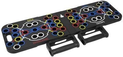 Składana deska do pompek z dwoma drążkami do pompek w zestawie. Różne kolory dla różnych grup mięśni: klatki piersiowej, barków, tricepsów i pleców. Dzięki różnym pozycjom i konfiguracjom uchwytów, deska nadaje się do różnorodnych ćwiczeń i dopasowuje się do różnych wzrostów, budowy ciała i wagi. Bezpieczne użytkowanie dzięki antypoślizgowym gumowym podkładkom i solidnym blokadom uchwytów. Kompaktowa i łatwa w transporcie.