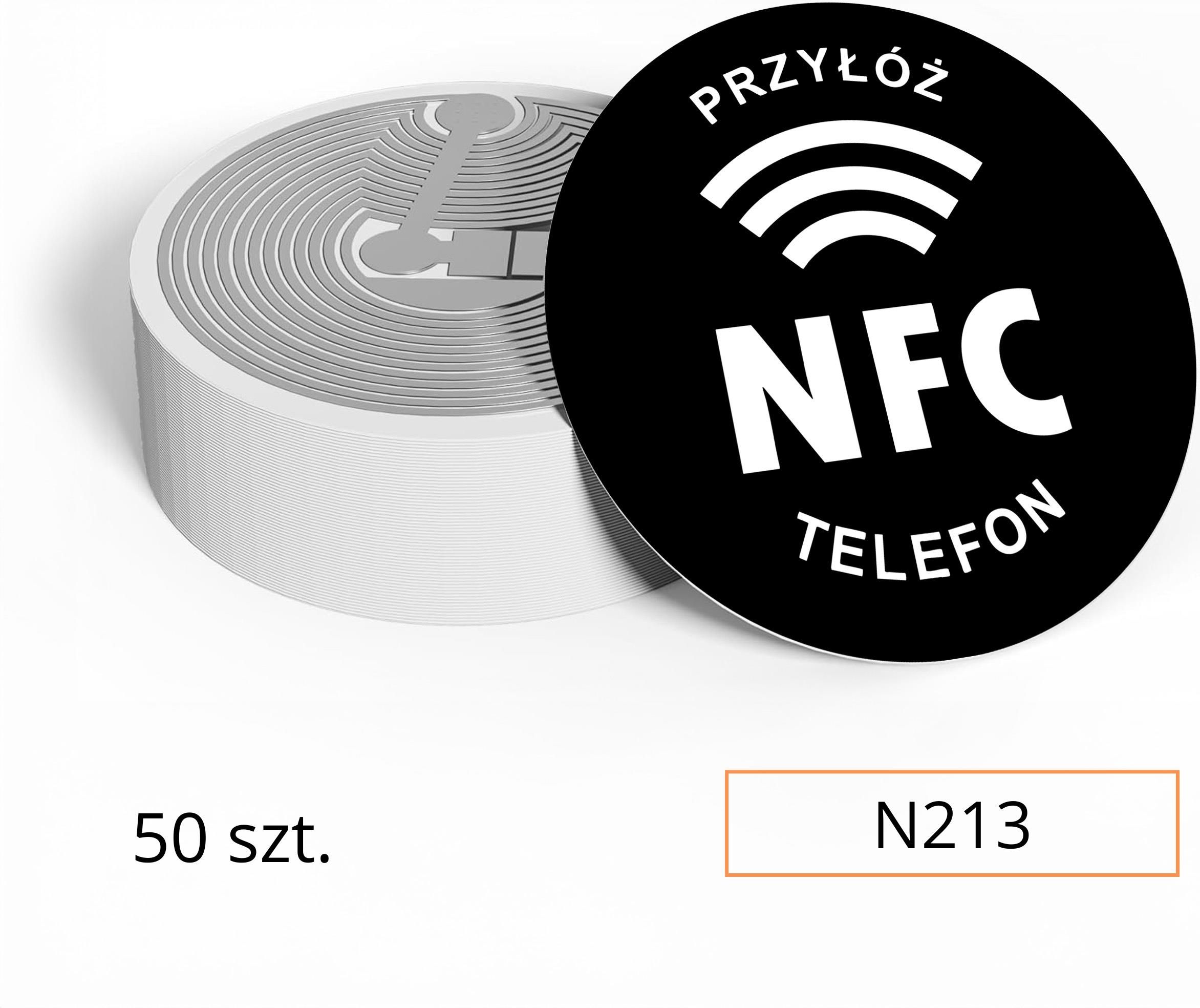 Tagi NFC NTAG213 Ø25 mm – 50 szt. | Czarna naklejka „Przyłóż telefon” Borne Sulinowo