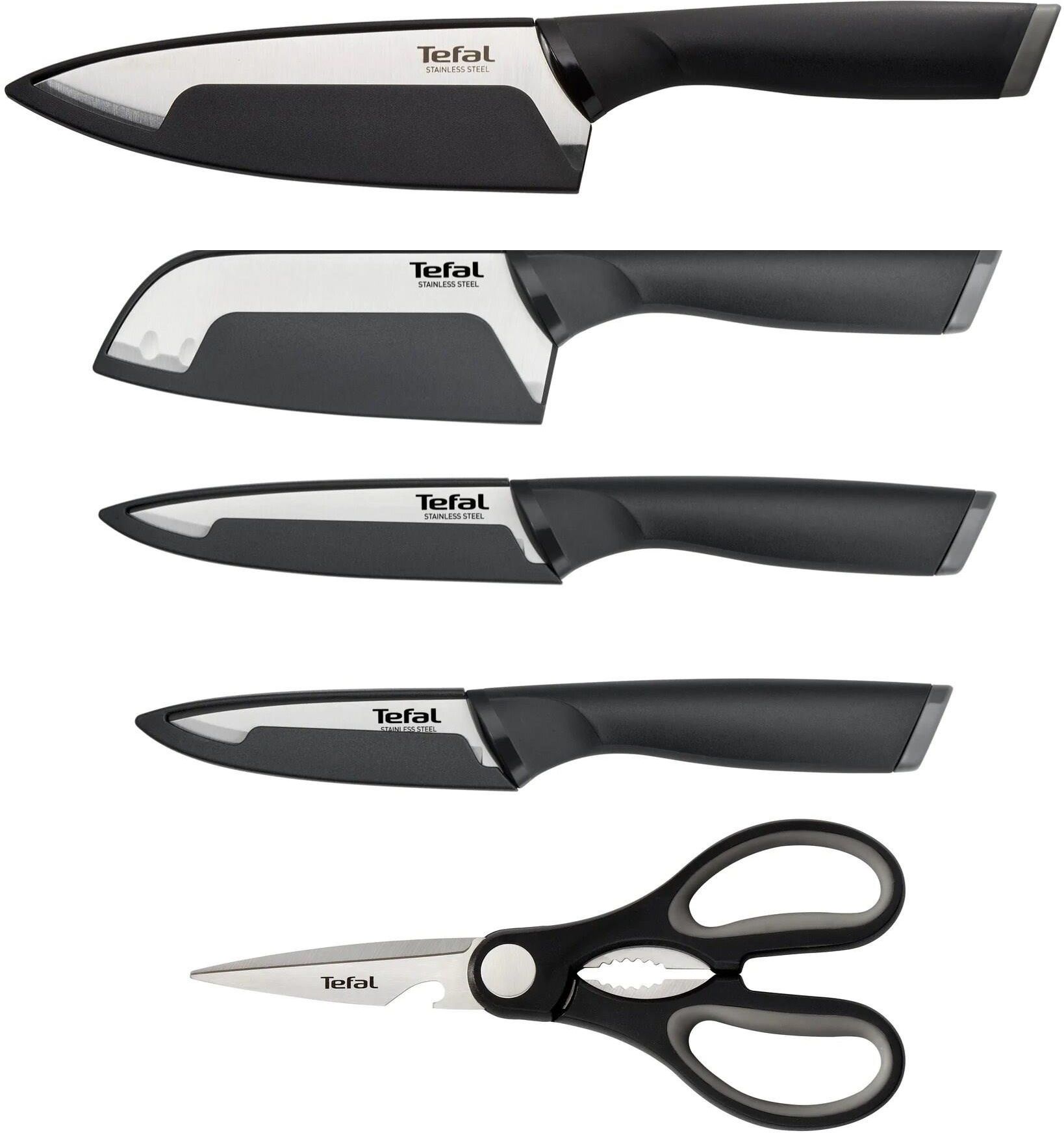 Tefal Comfort K2215S55 5 elementów Niezbędny zestaw w każdej kuchni! Wygodny uchwyt Soft Touch Ergonomiczny uchwyt gwarantuje komfort pracy oraz doskonałą kontrolę podczas cięcia. Natomiast powłoka Soft Touch zapewnia przyjemną w dotyku powierzchnię i pełną precyzję zarówno przy szybkim siekaniu, jak i dokładnym filetowaniu. Bezpieczne w użyciu i przechowywaniu Każdy nóż w zestawie ma własną osłonkę, która chroni ostrze i dłonie, a jednocześnie ułatwia bezpieczne i wygodne przechowywanie. Konkretne zastosowanie Każdy nóż w zestawie został zaprojektowany z myślą o konkretnych zadaniach – nóż szefa kuchni 15cm, do siekania i krojenia, santoku 12cm, do precyzyjnego siekania oraz przygotowywania ryb i innych delikatnych produktów, nóż uniwersalny 12cm, do porcjowania. Natomiast mały i poręczny nóż 9cm, idealnie sprawdzi się podczas obierania owoców i warzyw. Nożyczki przydadzą się przy wielu pracach w kuchni. Doskonała wydajność Ostrza z wysokiej jakości stali nierdzewnej zapewniają skuteczne cięcie i wysoką odporność na zużycie. Linia Comfort to świetny wybór zarówno dla amatorów, jak i profesjonalistów – trwałe, wygodne noże stworzone do codziennego użytkowania.