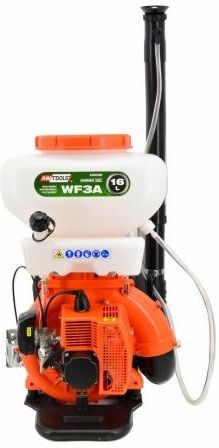 Opryskiwacz spalinowy plecakowy 2,9KM 16L WF3A Charakterystyka produktu Plecakowy opryskiwacz spalinowy firmy Awtools to przenośne, elastyczne i wysoce skuteczne narzędzie do ochrony roślin. Może być stosowany do ochrony roślin przed chorobami oraz szkodnikami w ogrodach, parkach, plantacjach, polach uprawnych itd. Zasilany wydajnym silnikiem spalinowym. Duża pojemność zbiornika i zasięg oprysku. Ergonomiczny system nośny. Adapter umożliwiający szybkie przezbrojenie opryskiwacza - substancje ciekłe/ granulat. Może być wykorzystany jako dmuchawa. Doskonała alternatywa dla opryskiwacza ręcznego. Dane techniczne Moc silnika: 2,13 kW (2,9 KM) Pojemność silnika: 41,5cc Wymiary: 490x410x770mm Pojemność zbiornika: 16L Paliwo: mieszanka benzyna/olej Zużycie paliwa: <530 g/kw.g Obroty silnika: obr./min. Typ zapłonu: CDI Sposób uruchomienia: ręczny starter z linką Wydajność rozpylania (ciecz/ proszek): >3l/min./ >4,2l/min. Zasięg rozpylania: >12m Waga: 9,5kg/ 13,0kg Standardowe wyposażenie 1 x Lanca z dyszą rozpylającą 1 x Pojemnik do rozrabiania mieszanki paliwowej 1 x Adapter do granulatu Przewód gumowy, zaciski, łącznik, klucz do świecy itp.