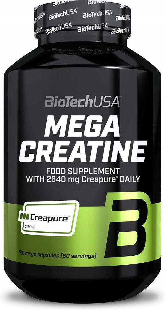 Mega Creatine to łatwo dozowalny suplement diety w kapsułkach. z najwyższej jakości kreatyny zawiera formułę zastrzeżoną Creapure®, która jest: czystości farmaceutycznej i mikronizowanej formie, która jako surowiec znajduje się na liście kolońskiej, używanej przez sportowców wyczynowych dzięki drobnej wielkości cząsteczek, bardzo dobrze się rozpuszcza, co sprawia, że jej wchłanianie jest bardziej efektywne niż w przypadku innych. Niemiecki surowiec O kreatynie! Kreatyna to najbardziej badany, od dziesięcioleci stosowany związek aminokwasów w żywieniu sportowym. Przenosi główne, ograniczone czasowo źródło energii dla mięśni, fosforan kreatyny (CP). To również wyjaśnia jego niezmienną popularność wśród sportowców wyczynowych i amatorów. Średnio, w zależności od dyscypliny sportowej i celów, spożywa się 2-10 g kreatyny dziennie (wyższe dawki, podzielone na kilka porcji). Już spożycie 3 g kreatyny dziennie może zwiększyć wydolność fizyczną podczas intensywnych, krótkich, powtarzających się ruchów. Co więcej! Nasze ciało potrafi wykorzystać kreatynę również w innych obszarach: pozytywnie wpływa na funkcjonowanie mózgu, sen, regenerację, a regularne przyjmowanie może łagodzić problemy psychiczne. Codzienne spożycie kreatyny jest korzystne nie tylko dla dwudziestolatków! 3 g kreatyny dziennie mogą zwiększyć wpływ treningu oporowego na siłę mięśni nawet po 55. roku życia – czyli poprawia wydajność, jeśli co najmniej trzy razy w tygodniu regularnie wykonujesz trening siłowy z obciążeniem wynoszącym co najmniej 65-75 procent maksymalnego obciążenia (ciężar, który możesz podnieść 4-6 razy z rzędu). 1 porcja (2 kapsułki) zawiera 2640 mg Creapure® 2322 mg kreatyny Komu polecamy kapsułki Mega Creatine? Zarówno kobietom, jak i mężczyznom nastawionym na wydajność. Tym, którzy chcą korzystać z pozytywnych efektów spożycia kreatyny w praktycznym rozwiązaniu, bez okresu ładowania! Dorosłym prowadzącym aktywny tryb życia – idealny wybór również dla osób powyżej 55. roku życia, jako uzupełnienie trzech treningów siłowych w tygodniu! Tym, którzy uprawiają sporty, gdzie ważna jest wybuchowość i robią wszystko, aby osiągnąć najwyższy poziom wydajności. Niezależnie czy to trening siłowy, sporty wytrzymałościowo-siłowe (np. cross-fitness), sporty zespołowe (np. piłka nożna) czy sporty walki. Propozycja wykorzystania Przyjmuj 1×2 kapsułki dziennie, podczas posiłku, popijając szklanką wody. Nie przekraczaj zalecanej dziennej dawki do spożycia! OSTRZEŻENIE: Przechowywać w sposób niedostępny dla małych dzieci! Suplement diety nie może być stosowany jako substytut (zamiennik) zróżnicowanej diety .. Nie zaleca się przyjmowania produktu przez osoby poniżej 18 roku życia, oraz przez osoby chore i/lub zażywające leki. Produktu nie powinny spożywać kobiety w ciąży lub kobiety karmiące piersią. Składniki Creapure® (monohydrat kreatyny) 88%, otoczka kapsułki (żelatyna), substancje przeciwzbrylające (sole magnezowe kwasów tłuszczowych, dwutlenek krzemu). Wyprodukowano w zakładzie przetwarzającym mleko, jaja, gluten, soję, orzeszki ziemnę, orzechy, seler, ryby, skorupiaki i składniki żywności zawierające dwutlenek siarki. NAJLEPIEJ SPOŻYĆ PRZED (dzień/ miesiąc/rok). NR PARTII: Patrz w białym polu (LOT/EXP). Podmiot odpowiedzialny za informacje na temat żywności: BioTechUSA Polska Sp. z o.o. ul. Zamkowa 21a lok. 4A, 95-200 Pabianice, Polska. Miejsce pochodzenia: UE. WARUNKI PRZECHOWYWANIA: Przechowywać szczelnie zamknięte w chłodnym i suchym miejscu.