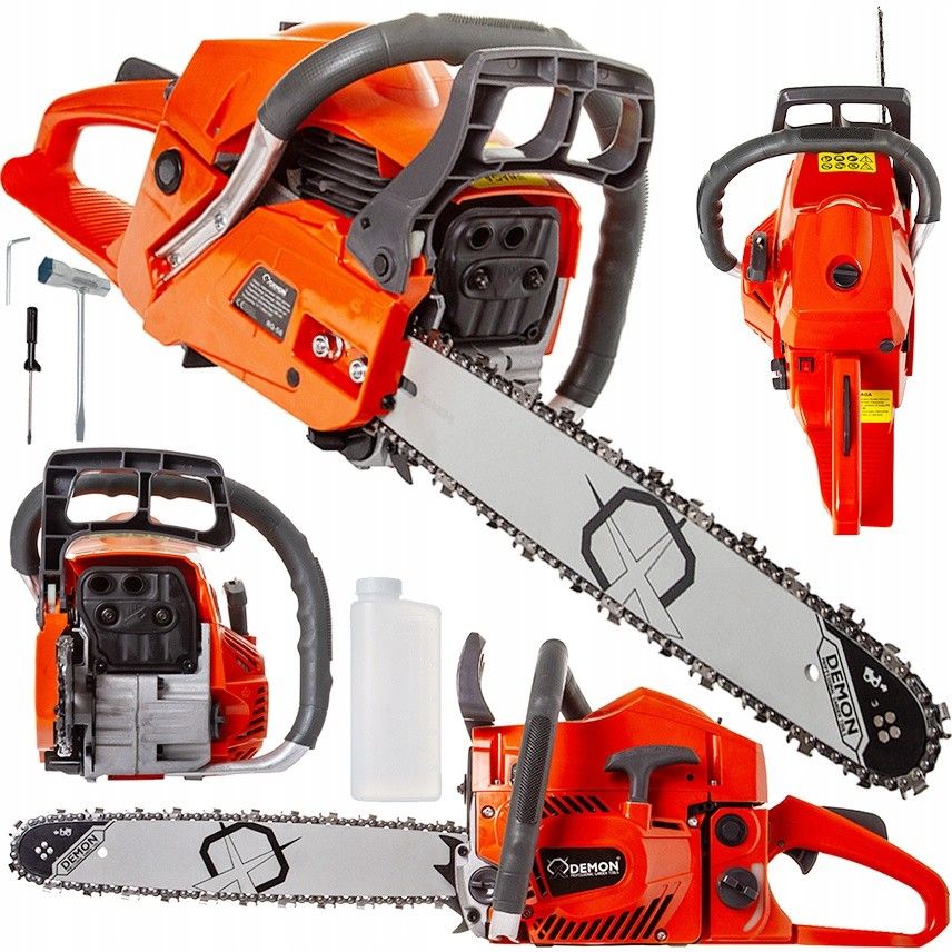 PIŁA SPALINOWA ŁAŃCUCHOWA GAŁĘZIOWA DO DREWNA RQ-58 2,2 KM DEMON Piła spalinowa DEMON RQ-58 o mocy 2,2 KM to uniwersalne i solidne narzędzie przeznaczone do prac ogrodowych, przydomowych oraz przygotowania drewna opałowego. Model ten łączy prostą obsługę z wydajnym, dwusuwowym silnikiem spalinowym chłodzonym powietrzem, co przekłada się na komfortową i bezpieczną pracę nawet przy dłuższym użytkowaniu. Dzięki dobrej ergonomii, systemowi antywibracyjnemu oraz automatycznemu smarowaniu łańcucha, pilarka sprawdzi się zarówno w rękach amatora, jak i bardziej doświadczonego użytkownika. To praktyczne rozwiązanie dla osób, które oczekują niezawodnej pilarki do drewna, zdolnej do cięcia gałęzi, kłód, belek czy przygotowania opału do kominka, bez konieczności inwestowania w ciężki sprzęt profesjonalny. Zastosowanie i funkcje urządzenia Pilarka spalinowa DEMON RQ-58 została zaprojektowana jako narzędzie wielozadaniowe, odpowiednie do szerokiego zakresu prac związanych z obróbką drewna. Dzięki mocy 2,2 KM oraz użytkowej długości cięcia 38 cm, urządzenie dobrze radzi sobie z typowymi zadaniami przydomowymi i ogrodowymi. Najczęstsze zastosowania pilarki: cięcie drewna opałowego do kominka i pieca, przycinanie gałęzi drzew i krzewów, prace porządkowe w ogrodzie i na działce, przygotowanie belek i desek do prostych konstrukcji, drobne prace leśne i gospodarcze, prace remontowe i naprawcze wokół domu. Pilarka wyposażona jest w błyskawiczny napinacz łańcucha, który umożliwia szybkie i wygodne napięcie bez konieczności długiego regulowania. Automatyczne smarowanie łańcucha zapewnia płynną pracę układu tnącego i zmniejsza zużycie elementów roboczych. Najważniejsze cechy i korzyści Mocny silnik dwusuwowy 2,2 KM Sercem pilarki DEMON RQ-58 jest dwusuwowy silnik spalinowy o maksymalnej mocy 2,2 KM, który zapewnia odpowiednią dynamikę i skuteczność cięcia. Silnik pracuje w zakresie do 8500 obr./min, co pozwala na sprawne przecinanie drewna o różnej twardości. Korzyści: dobra wydajność przy kompaktowej konstrukcji, płynna praca bez spadków mocy, możliwość pracy w terenie bez dostępu do prądu. Chłodzenie powietrzem i aluminiowe elementy silnika Dwusuwowy silnik jest chłodzony powietrzem, co skutecznie chroni go przed przegrzaniem. Zastosowanie aluminiowych tłoków i cylindra dodatkowo zwiększa odporność na wysoką temperaturę oraz wydłuża żywotność całej jednostki napędowej. Blok silnika wykonany z aluminium: zmniejsza masę urządzenia, poprawia odprowadzanie ciepła, wpływa na niższe zużycie paliwa. System hamulcowy i bezpieczeństwo Pilarka została wyposażona w dodatkowy system hamulcowy, który zwiększa bezpieczeństwo użytkownika w trakcie pracy. Rozwiązanie to pozwala szybko zatrzymać ruch łańcucha w sytuacjach awaryjnych. Automatyczne smarowanie łańcucha Automatyczny układ smarowania dba o właściwe naoliwienie łańcucha i prowadnicy, co: zmniejsza tarcie, poprawia płynność cięcia, wydłuża żywotność elementów tnących, ogranicza ryzyko przegrzania prowadnicy. System filtracji powietrza Zastosowany system filtracji powietrza chroni silnik przed zanieczyszczeniami i pyłem powstającym podczas pracy z drewnem. Dzięki temu pilarka zachowuje stabilne parametry pracy nawet w trudniejszych warunkach. System antywibracyjny Pilarka DEMON RQ-58 posiada system antywibracyjny, który redukuje drgania przenoszone na dłonie użytkownika. Przekłada się to na: większy komfort pracy, mniejsze zmęczenie przy dłuższym użytkowaniu, lepszą kontrolę nad narzędziem. Dobre wyważenie i ergonomia Urządzenie cechuje się dobrym wyważeniem, co ułatwia prowadzenie pilarki i precyzyjne cięcie. Masa netto bez prowadnicy wynosi 4,9 kg, dzięki czemu sprzęt pozostaje poręczny i stosunkowo lekki jak na pilarkę spalinową tej klasy. Dane techniczne Parametr Wartość Model DEMON RQ-58 Typ urządzenia piła spalinowa łańcuchowa Rodzaj silnika dwusuwowy, chłodzony powietrzem Maksymalna moc silnika 2,2 KM Obroty biegu jałowego 2 800 obr./min Obroty maksymalne 8 500 obr./min Użytkowa długość cięcia 38 cm Masa netto (bez prowadnicy) 4,9 kg Pojemność zbiornika paliwa 550 ml Pojemność zbiornika oleju 260 ml Koło zębate 7T / 0,325 Szerokość rowka prowadnicy 1,5 mm Zalecana średnica pilnika 4,75 mm Smarowanie łańcucha automatyczne Filtracja powietrza tak System antywibracyjny tak Wskazówki użytkowe / bezpieczeństwo Przed rozpoczęciem pracy sprawdź poziom paliwa i oleju do smarowania łańcucha. Regularnie kontroluj napięcie łańcucha – zbyt luźny lub zbyt napięty może powodować szybsze zużycie. Podczas pracy zawsze używaj środków ochrony osobistej: rękawic, okularów, kasku i ochronników słuchu. Nie pracuj pilarką bez sprawnego systemu smarowania łańcucha. Unikaj cięcia powyżej wysokości ramion oraz pracy jedną ręką. Po zakończeniu pracy oczyść prowadnicę, łańcuch i filtr powietrza. Przechowuj pilarkę w suchym miejscu, z założoną osłoną prowadnicy. Dlaczego warto wybrać ten model Pilarka spalinowa DEMON RQ-58 to rozsądny wybór dla użytkowników, którzy potrzebują solidnego i uniwersalnego narzędzia do prac przydomowych i ogrodowych. Model ten oferuje dobrą relację mocy do masy, prostą obsługę oraz rozwiązania poprawiające komfort i bezpieczeństwo pracy. Zastosowanie aluminiowych elementów silnika, systemu antywibracyjnego i automatycznego smarowania sprawia, że pilarka jest trwała i wygodna w codziennym użytkowaniu. Typowe zastosowania przygotowanie drewna opałowego, cięcie gałęzi i konarów, prace porządkowe w ogrodzie, drobne prace leśne, zastosowania gospodarcze, prace remontowe i konstrukcyjne z drewnem. Zawartość zestawu piła spalinowa DEMON RQ-58, prowadnica, łańcuch tnący, osłona prowadnicy, butelka do przygotowania mieszanki paliwowej, klucz do świec, śrubokręt, imbus. Podsumowanie P