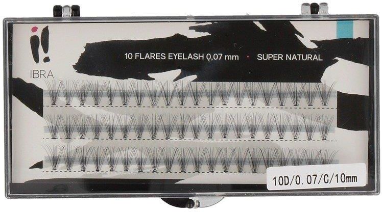 Ibra - ,,NATURALS" FLARES EYELASH - KNOT-FREE - Kępki sztucznych rzęs - 0.07- C -10 mm 10 FLARES EYELASH - KNOT-FREE NATURALS marki Ibra. Kępki rzęs o profilu C. Wersja NATURALS sprawia, że rzęsy będą wyglądały na powiekach bardzo naturalnie. Ponadto, nadadzą spojrzeniu zalotnego efektu. Są bezproblemowe w aplikacji i niewyczuwalne podczas noszenia. W jednym opakowaniu znajduje się 60 kępek, wykonanych z włosa syntetycznego. Całość umieszczono w zamykanej, plastikowej kasetce, która ułatwia transportowanie i przechowywanie. Kępki rzęs. W skład jednego zestawu wchodzi 60 kępek. Zapewniają naturalny, zalotny efekt. Umieszczone w opakowaniu ułatwiającym transport. Wykonane z syntetycznych włosów.