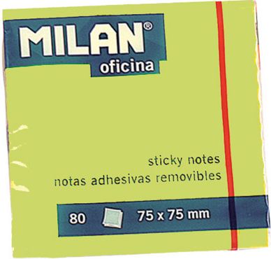 Karteczki samoprzylepne w neonowym zielonym kolorze. Rozmiar: 76 x 76 mm, 100 kartek. Producent: GPSR FACTIS, S.A. Barri Morena 4 17253 MONT RAS (Girona), HISZPANIA (PL) tel: email: info@milan.es