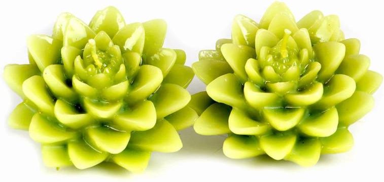 - zestaw świeczek w kształcie sukulentów - forma rośliny o trójkątnych listkach - zapakowane w pudełko z przezroczystą pokrywką - ilość: 2 szt. - wymiary (wysokość x średnica): 4,5x9 cm
