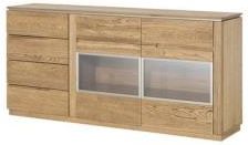 Komoda 2-drzwiowa do salonu i pokoju dziennego. Częściowo przeszklone drzwi zapewniają doskonałą ekspozycję naszych ulubionych książek, bibelotów lub dekoracji. Ramka szyby wykonana została ze stali szczotkowanej, co nadaje jej intrygującego wyglądu. Dodatkowe zamykane półki o dużej pojemności …