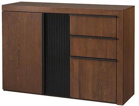 Komoda 2-drzwiowa z 3 szufladami PARIS 46 wykonana z wysokiej jakości płyty fornirowanej oraz drewna, stanie się nie tylko praktycznym elementem wyposażenia, ale również piękną dekoracją każdego wnętrza. W połączeniu z akcentami czerni wprowadza do pomieszczenia ciepłą, przytulną atmosferę, jednocześnie nadając mu nowoczesny charakter. Jej gładkie linie i minimalistyczny design sprawiają, że doskonale wpisuje się w aktualne trendy aranżacyjne, idealnie komponując się z innymi elementami wystrój. Model PARIS 46 to rozwiązanie dla osób ceniących sobie porządek i przestronność. Wyposażona w praktyczne półki oraz szuflady oferuje dużo miejsca do przechowywania. Dzięki temu możesz z łatwością przechowywać zarówno większe przedmioty, takie jak książki czy dekoracje, jak i mniejsze akcesoria, które chcesz mieć zawsze pod ręką.