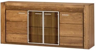 Komoda drewniana Velvet 49 dąb rustical SZYNAKA MEBLE Efektowna i nowoczesna komoda z witryną. Bardzo pojemna i stylowa komoda z drewnianym frontem i szybą wykonaną ze szkła hartowanego zapewni idealne miejsce do przechowywania. Kolor: dąb rustical Front: lite drewno dębowe z elementami szropowanymi (dąb lity łupany i szczotkowany), szkło hartowane - bezbarwne Korpus: zew.: płyta meblowa w naturalnej okleinie dębowej (fornir); wew.: płyta meblowa w dekorze drewnopodobnym Kolekcja Velvet dostępna jest także w kolorze dąb czarny. Mebel dostarczamy w całości, bez konieczności montażu. Wyjątkowy zestaw mebli do sypialni. Drewniane fronty, hartowane szkło i opcjonalne oświetlenie tworzą niezwykłe połączenie, które spełni wszystkie Twoje oczekiwania. Ciepłe kolory i estetyczne wykończenie zapewnią nietuzinkowy styl we wnętrzu. Meblemodułowe Velvet z linii Prestigeline to ogromny wybór kształtów i przemyślanych rozwiązań. W ofercie znajdują się także meble do salonu i pokoju dziennego. Wymiary: Szerokość: 201 cm Wysokość: 88 cm Głębokość: 42 cm Dodatkowo, do witryny można dodać oświetlenie LED do szklanych półek: +192 zł Zestaw oświetleniowy półki szklanej - 3-L-BC-1-0400-02 - 1 x listwa 400 mm, 3 kierunki rozchodzenia się światła : góra, dół i przez półkę, 1 x transformator; światło białe ciepłe LED