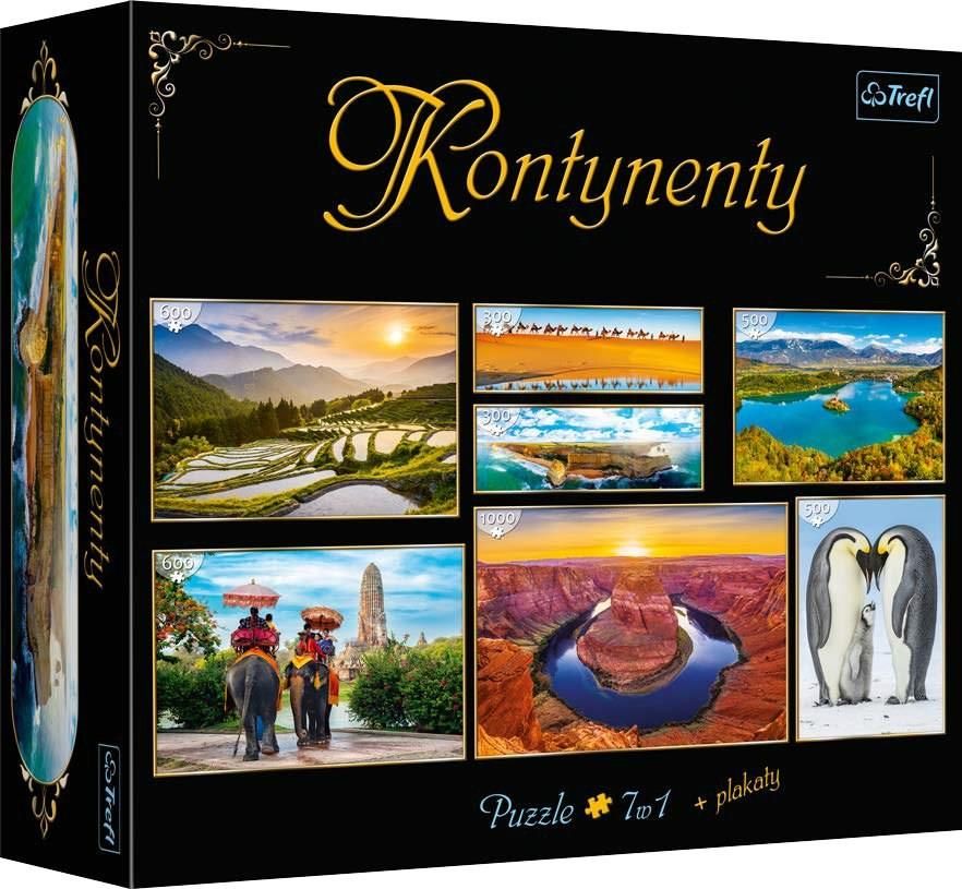 Trefl Puzzle 7w1 Kontynenty 90793 Zestaw puzzli przedstawiających: - Dwunastu Apostołów - 300el. - Pola ryżowe w Japonii - 600el. - Antarktyda - 500el. - Horseshoe Bend - 1000el. - Jezioro Bled - 500el. - Sahara – 300el. - Miasto Ayutthaya w Tajlandii - 600el. Zaletami puzzli Trefl są: dokładne dopasowanie elementów intensywne kolory grafiki tematyczne plakaty