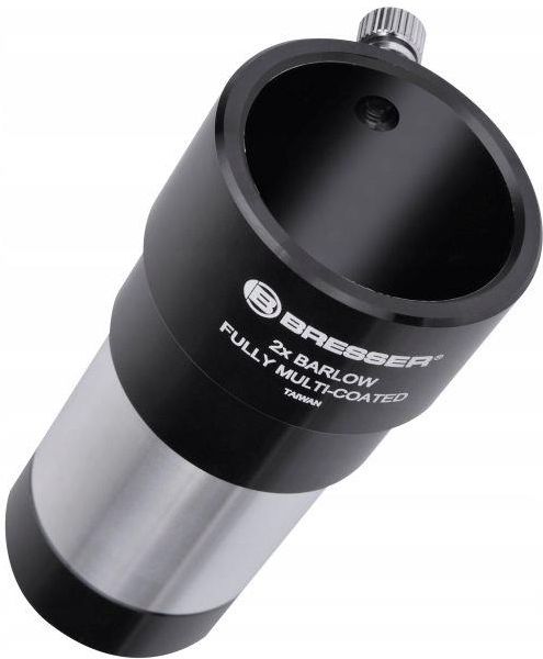 Achromatyczna soczewka Barlowa 2x - Bresser Soczewka Barlowa Bresser zawiera dwuelementowy zestaw w pełni powlekanych soczewek zapewniających świetną korektę kolorów oraz ostrość. Wyczernione krawędzie soczewek zapewniają maksymalny kontrast obrazu. Modułowa budowa soczewki pozwala na trzywariantowe jej użycie: Wariant I - soczewka Barlowa 2x Wykorzystanie kompletnej soczewki pozwala na 2 krotne zwiększenie powiększenia użytego okularu. Przykładowo okular 30mm wraz z soczewką Barlowa będzie funkcjonował jak okular 15mm. Wariant 2 - soczewka Barlowa 1,5x. Element Barlowa osadzony w cylindrycznej, metalowej części soczewki może być wykręcony. Jest on kompatybilny z większością okularów 1,25" wyposażonych w gwint filtrowy. Instalując go w okularze przy wykorzystaniu gwintu filtrowego okularu uzyskujemy układ pozwalający na 1,5x zwiększenie powiększenia użytego okularu. Przykładowo okular 30mm wraz z elementem Barlowa będzie funkcjonował jak okular 20mm. Wariant 3 - złączka okularowa 36mm. Tubus soczewki bez elementu Barlowa może być wykorzystany jako 36mm złączka okularowa prosta w stosunku do nieparafokalnych okularów 1,25" w teleskopach z 1,25" wyciągiem okularowym. Podczas użytkowania soczewki Barlowa należy zwrócić uwagę że zmieni się punkt ogniskowania teleskopu. Efektem tego będzie ogniskowe przemieszczenie wewnętrzne lub zewnętrzne. Soczewka Barlowa 2x Bresser będzie wymagała przynajmniej 2mm przemieszczenia zewnętrznego. Dokładna wartość tego parametru uzależniona będzie od mechaniki poszczególnych teleskopów. Ze względu na to niektóre okulary w konfiguracji z daną soczewką Barlowa mogą nie zapewnić odpowiedniego ogniskowania. Dane techniczne: Konstrukcja optyczna układ achromatyczny Współczynnik powiększenia 2x Średnica obsady 1,25" Ilość soczewek 2 Rodzaj powłok FMC Waga 93 g
