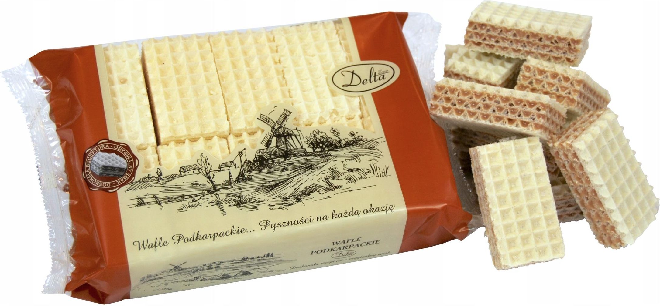 Tradycyjne wafle podkarpackie przekładane masą o smaku karmelowym. Opakowanie 450g zawiera 20 sztuk produktu. Termin ważności deklarowany przez sprzedawcę to 2 miesiące od wyprodukowania, dostarczony towar powinien przy dostawie powinien mieć nie mniej niż ¾ tego okresu (do ok. 6 tygodni).