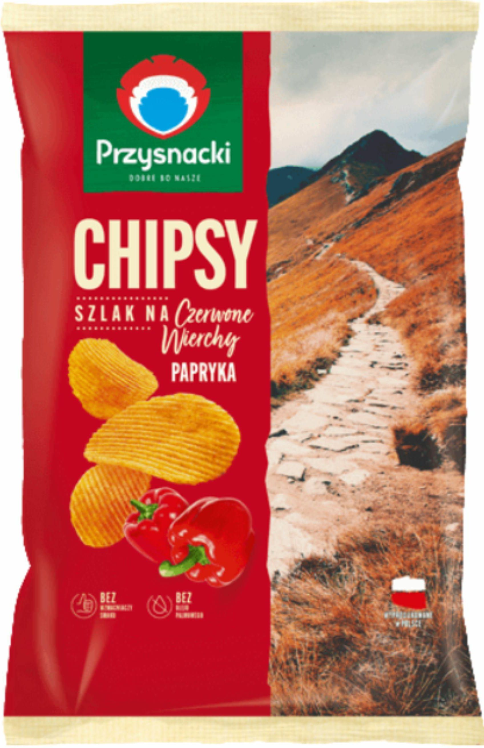 Zestaw Przysnacki Chipsy Ziemniaczane o Smaku Paprykowym 130g 9szt Przysnacki Chipsy Szlak na Czerwone Wierchy to chrupiące, karbowane chipsy ziemniaczane o intensywnym smaku papryki. Produkowane w Polsce, bez glutenu i oleju palmowego – idealne na każdą wędrówkę, imprezę czy filmowy wieczór. Inspiracja tatrzańskim szlakiem dodaje im wyjątkowego charakteru! Szczegóły Marka: Przysnacki Produkt: Chipsy ziemniaczane o smaku papryki Waga: 130 g (1 opakowanie), 1170 g (9 sztuk) Smak: paprykowy Forma: karbowane chipsy w dużym opakowaniu Cechy: produkt bezglutenowy, bez oleju palmowego, produkowany w Polsce Chrupiący smak przygody – prosto z serca polskich gór!