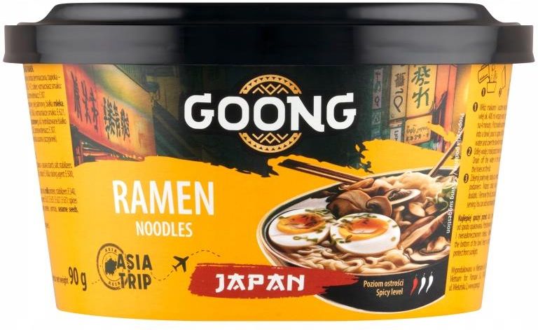 Goong Danie instant z makaronem typu noodle i sosem o smaku Ramen 90 g Producent: PAMAPOL Kod kreskowy: 5904915793796 Waga jednostkowa brutto: 0.09 kg Wartość energetyczna: 979 kJ / 234 kcal Składniki makaron typu noodle 71,1 %: mąka pszenna, olej palmowy, skrobia ziemniaczana, tapioka - skrobia z …