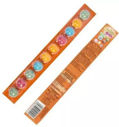 KARTON ZBIORCZY ZAWIERA - 50 SZTUKSKŁADNIKI:cukier, baza gumowa (przeciwutleniacz E321), syrop glukozowy, aromaty, substancja utrzymująca wilgoć: glicerol, barwniki (E160a, E120, E133), substancja glazurująca E901.Może zawierać śladowe ilości Soi.Przechowywać w suchym i chłodnym miejscu