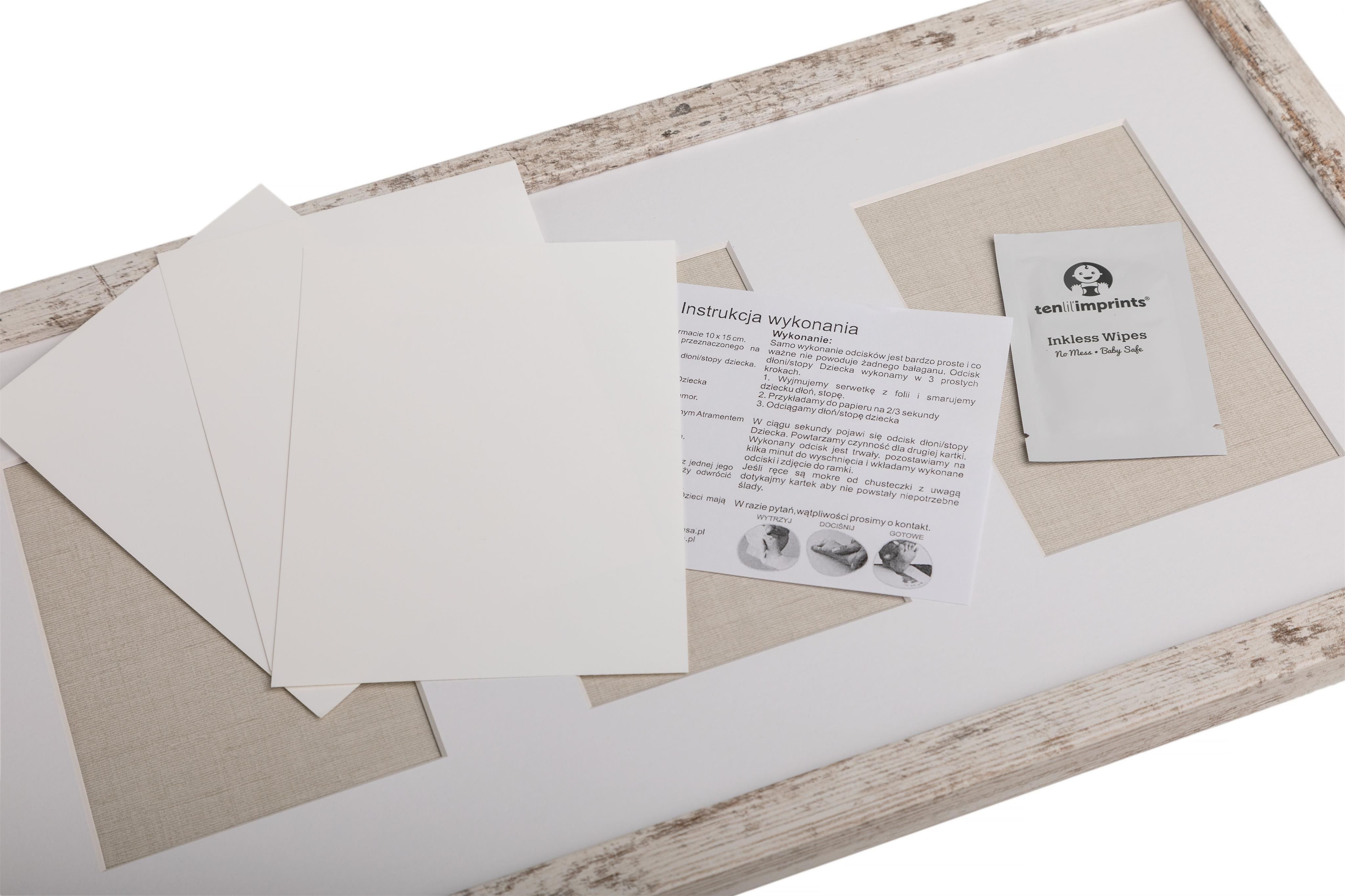 Tiny memories potrójna ramka, magiczny atrament Kolor: Naturalny brzoza Tiny Memories – Potrójna ramka z Magicznym atramentem. Przedstawiamy Państwu nasz nowy produkt, który będzie wspaniałą pamiątka na długie lata. Ramka na zdjęcia, w której zmieścimy dwa odciski rączki/stópki Dziecka oraz 1 zdjęcie. Sama ramka dostępna jest w dwóch wersjach, klasycznej białej oraz z wykończeniem Kora Brzozy. Co najważniejsze jednak w tym produkcie to całkowicie innowacyjny sposób wykonania samego Odcisku. Zrobimy to szybko sprawnie i bez najmniejszego nawet bałaganu, mimo że odcisk wykonywany jest za pomocą atramentu. Nie jest to jednak zwykły atrament. W zestawie znajduje się wilgotna ściereczka, którą zwilżamy dłoń/ stopę Dziecka, przyciskamy do specjalnego papieru i w ciągu sekundy pojawia się idealny odcisk. Odcisk jest doskonałą kopią a co ważne jest tez bardzo trwały. Całkowicie bezpieczna Całość jest całkowicie bezpieczna, tego typu produkty są wykorzystywane w szpitalach do identyfikacji nowo narodzonych Dzieci. Do zestawu dołączone są 3 kartki papieru, jedna na próbę lub na dodatkowy odcisk. Wilgotna ściereczka jest wielokrotnego użytku, na pewno wystarczy na zrobienie trzech odcisków. Ochronne pleksi Sama ramka wyposażona jest w pleksi, które ochroni nasze zdjęcie i odciski przed kurzem. Nasz produkt idealnie nadaje się na prezent, klasyczne białe kolory dopasują się do każdego wnętrza, samo wykonanie odcisku będzie wspaniałą zabawą. Każdy z Rodziców może także odbić np. swój odcisk palca. Zawartość zestawu: 1. Całkowicie innowacyjny atrament 2. Szybkie i łatwe wykonanie 3. Idealnie ostry Odcisk zawierający każda linię papilarną 4. Duża ramka 52 x 22 cm 5. Rozmiar zdjęcia 10 x 15 6. Trzy Kartki na odcisk