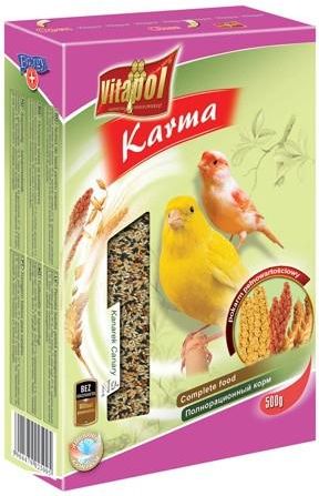 Pełnoporcjowa karma dla kanarków w opakowaniu 500 g. Mieszanka zawiera ziarna i nasiona występujące w naturalnym środowisku bytowania ptaków. Karma została wytworzona z najwyższej jakości ziaren i jest całkowicie dostosowana do wymogów żywieniowych kanarków. Karma dostarcza ptakom witaminy A, A2, B6, B12, E, enzymy, magnez, żelazo, cynk, miedź, kobalt, fosfor i sole mineralne, śluzy roślinne. Pokarm dla kanarków pozytywnie wpływa na układ trawienny. Zawarte w składzie konopie wpływają na pobudzenie samców do śpiewu i lęgów. Dawkowanie: 2-3 łyżeczki dziennie w zależności od zapotrzebowania ptaka. Skład: nasiona mozgi kanaryjskiej, nasiona rzepaku, nasiona rzepiku, proso czerwone, proso żółte, siemię lniane, nasiona konopi, owies łuskany, mąka z ziarna kukurydzy, mąka z ziarna pszenicy, karoten, mączka z lucerny Skład analityczny: białko surowe: 14,52 % oleje i tłuszcze surowe: 7,9 % włókno surowe 12,8 % popiół surowy: 5,4 % wilgotność: 12 %
